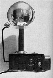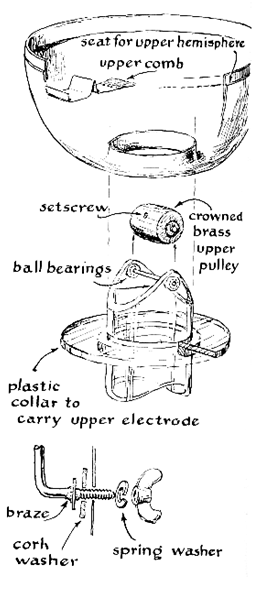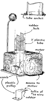 F J. Hedley, of Lancaster in England, submits an interesting version of the Van de Graaff electrostatic generator that was described in this department in April, 1955. His machine demonstrates that a resourceful amateur can sometimes improve on the performance of a design by substituting his own materials. The version of the Van de Graaff machine described here last year has a rubber belt which runs between a pair of pulleys, one made of metal and the other of polyethylene. They are enclosed in insulated housings that serve as high-voltage terminals. Static electricity, generated frictionally between the belt and the polyethylene pulley, is transported by the belt to the metal pulley, where the charge is transferred to the terminal by a comb of metal points. The work expended in moving the charge up the belt increases the voltage. Machines of this type employing belts an inch wide and a foot or so long can generate a continuous current of several microamperes at potentials up to 100,000 volts. They permit scores of fascinating experiments, particularly those involving gas discharge tubes. A number of amateurs have requested more specific information about the construction details of the "baby" Van de Graaff. Hedley writes the following report on his machine. "I have now made two Van de Graaffs, the first substantially the same as the one described in 'The Amateur Scientist.' The second machine is twice as large [see photograph, right ]. It performs quite satisfactorily, giving bright intermittent sparks about four inches long and weaker ones six inches or more in length when one's hand is brought near the underside of the terminal. "The machine is supported by a housing which encloses the motor and lower comb assembly. The housing consists of 1/16-inch sheet steel welded to form a rectangular box measuring six inches high, six inches wide and eleven inches long, the base being of 3/16-inch steel. A detachable cover at one end provides access to the motor. One side can also be removed for exposing the pulley, comb assembly and belt. "The belt is powered by a series-wound motor (Royal Air Force war surplus) which runs under full load at a speed of 6,000 revolutions per minute. This is fitted with a pulley machined from polyethylene, one and a quarter inches in diameter and one and three quarters inches long. It is crowned slightly and makes a driven fit with the shaft. A wooden pulley of the same size with a jacket of polyethylene would work equally well. The jacket could be covered with a layer of polyethylene friction tape of the kind now sold by dealers in electrical supplies, or it could be made of a cylindrical section cut from one of the small polyethylene bottles in which cosmetic preparations are commonly sold. "The lower comb assembly consists of a bracket made of 1/16-inch sheet copper, an inch and five eighths wide, to which six tufts of number 86 copper wire are soldered at one end. The wires are spread out to form an even row and clipped straight at the ends [see drawing in Figure 5]. The brush assembly is bolted to the base plate and adjusted to bring the wire comb slightly above the center of the pulley. "A switch for operating the motor and a small neon bulb are mounted in the fixed side of the housing. The lamp glows when the machine is operating properly. Originally I mounted it on top of the housing but lost several bulbs when they were perforated by high-voltage sparks! "A tube of clear plastic, three inches in diameter and 18 inches long, which makes a push fit with a polished pipe flange bolted to the housing, supports the upper terminal. The inner threads are filed from the flange prior to assembly. The upper end of the tubing is beveled, and two holes are drilled on the diameter to receive a pair of ball bearings. A X-inch shaft turns in these and supports a crowned brass pulley which matches the size of the lower pulley. The pulley makes a sliding fit with the shaft and is anchored with a set screw. This arrangement provides for easy disassembly when changing the belt. "The high-voltage terminal consists of a nine-inch spherical copper float of the type commonly used in industrial plumbing. It is split on the diameter by means of a thin hack-saw blade. A flat, narrow ring is soldered to the inner edge of the lower half, on which the upper half makes a snug fit and clean joint. A two-inch hole is cut in the center of the lower hemisphere and the metal is worked into a doughnut shape by means of a rawhide hammer and rounded anvil. A cylindrical collar is then soldered to the inner face of the re-entrant edge for an easy fit with the plastic tubing. The upper collecting comb is bolted to a lug soldered to the inner surface of the lower hemisphere. A kink in the bracket provides for final adjustment relative to the center of the upper pulley. "A disk of 1/4-inch plastic, six inches in diameter, serves as a platform for supporting the upper terminal. A hole is cut in the center for admitting the plastic tube, to which the disk is fastened by one of the quick-drying plastic cements. In addition to supporting the terminal, the disk minimizes corona discharge from the bottom of the terminal. A discharge gap is provided at the side of the machine, as shown in the drawings. "These machines are sensitive to the high humidity prevalent in England, and for reliable operation I found it necessary to install a 50-watt heating element inside the motor housing. My next project will be a Van de Graaff of the type in which the charge is sprayed onto the belt at the lower pulley by a high-voltage source. I should appreciate any constructional tips that amateurs who have built such machines would care to pass along."