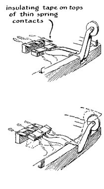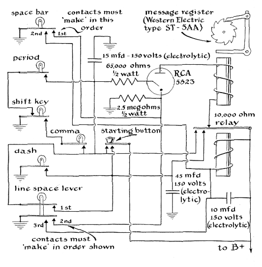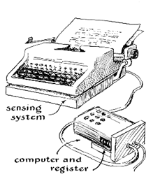 "As 'thinking' machines go," writes Shea, "my special-purpose computer stands pretty low on the I.Q. scale. It has just enough of a 'brain' to count words as they are written on a typewriter. The project was suggested by the article, 'Translation by Machine,' which appeared in the January, 1956, issue of SCIENTIFIC AMERICAN. A translating machine, the author pointed out, must first of all be capable of recognizing a word when one is presented for translation and of keeping track of sequences words. In short, it must count and record dissimilar entities occurring at random without apparent logical or mathematical relationship. The pronoun 'I' must count as heavily as the noun 'antidisestablishmentarianism,' and the machine may draw no distinction been a simple word such as 'cat' and a compound one such as 'brother-in-law.' "At first glance the problem looks easy. Why not solve it simply by counting the spaces invariably left between words? The space bar of a typewriter would be fitted with a mechanical device which would register a count for each space and, hence, for each word. This obvious solution is ruled out by several difficulties, including the fact that there is no space after a sentence ending a line and that a word may be broken by a hyphen at the end of a line. Punctuation also introduces some problems: for instance, a comma usually ends a word, but it may also come within a set of digits making a number. "In addition, there are certain limitations imposed by the typewriter itself. In my case, for example, the proposed computer was to be associated with a portable typewriter used daily both at school and at home. The computer could not be permitted to impair either the operation or portability of the machine. Moreover, I did not wish to mar the appearance of the typewriter by drilling holes in it or cluttering the frame with switches or other electrical parts. This requirement was finally met but at some cost, under certain circumstances, to the accuracy of the count of words. "The computer I have designed for the purpose is a separate machine housed in two units. One holds the sensing elements and logic circuits; the other houses the memories, 'brain,' output register and power supply. The sensing elements are electrical switches, actuated mechanically by the typewriter keys. The switches are assembled in an inch-high rectangular box which serves as a base for the typewriter [see Figure 1]. The homemade switch arms are L-shaped pieces of plywood hinged at the outer end of the L's horizontal arm, which also carries contacts of strip copper. The upper end of each L touches the bottom of the appropriate typewriter-key lever. The compromise with the accuracy of count was made in the case of the linespace lever. Ideally the line-space lever and its switch would be linked directly. Instead I arranged for the carriage, when extended, to bear against a roller carried at the end of one oversized L. Thus the carriage, not the line-space lever, actuates the switch. The contact arrangement of this switch is such that a single impulse is transmitted when, and only when, the carriage is returned to the beginning of a line. The electrical circuit is completed when the movable contacts wipe across the fixed contacts in one direction. The opposite face of the movable contacts is insulated by a layer of friction tape. Hence no connection is made during the return wipe [see Figure 2]. All switches are wired to a multiprong receptacle mounted in the rear wall of the shallow box. Connection with the computer unit is made through a multiprong plug and cable. "When amateurs first became interested in building complex switching systems, good relays could be picked up inexpensively on the surplus market, and most early computers were designed around them. That source is now largely exhausted. So my design is based on electronic components. These have proved not only cheaper than relays but more effective and far more interesting. Electrolytic capacitors serve as memory units. I could find no reference in the literature to such an application of electrolytic capacitors in commercial computers. Conventionally they are equipped with magnetic components such as recording tapes, ferrite cores and so on. But I took a chance on capacitors because they are inexpensive and available in all radio supply stores. "The brain of the machine consists of a single 'neuron'-an RCA-5823 gas triode. The mechanical structure of this tube resembles that of a conventional high-vacuum triode, but its operating characteristics are different. In a high-vacuum triode the flow of current between the plate and cathode can be minutely controlled by varying the charge on the grid. The gas triode, on the other hand, is an all-or-nothing device. When its grid is at zero potential with respect to the cathode, substantially no current can flow in the plate-cathode circuit if the plate voltage is below a critical value-about 200 volts in the case of the RCA-5823-at which the gas in the tube becomes ionized. But if a positive charge of about 75 volts is placed on the grid, it initiates a self-sustaining ionization of the gas, and current starts to flow in the plate-cathode circuit. It will continue to flow until the potential across the plate-cathode terminals is interrupted-even though the charge on the grid is reduced to zero. In other words, the grid loses control the instant conduction is initiated in the plate-cathode circuit. Like a neuron, the gas-filled triode either fires or refuses to fire, depending upon the state of charge on the grid. "A message register of the type used in telephone central offices to meter calls serves as the output mechanism of the computer. It consists of a modified and elaborated relay in which the armature actuates a wheel-type counter through a ratchet. The energizing coil is wired in series with the plate-cathode circuit of the gas triode [see diagram in Figure 3]. Whenever the tube fires, a count is