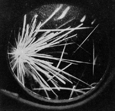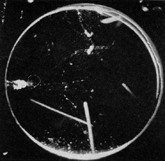 "In spite of its imperfections, my machine has supported the design theory, and since I am only a hunt-and-peck typist, the slowness of the apparatus gives me no trouble. I get as much fun out of it as if it were able to count 100 words per minute. "The capacitors, brain assembly, register and power supply are mounted on a common chassis enclosed by a container made from a liquid-floor-wax can which measures only two inches wide, four inches deep and eight inches long. The power supply is of the conventional voltage doubler type. It operates from 110 volts a.c. and is designed around a 117Z6 twin diode, the circuit of which is described in standard reference texts. The 10,000-ohm relay is of the type used for controlling the heat of electric blankets. I converted it for slow release by connecting a 10-microfarad capacitor during times when the tube is conducting. The 2.5-megohm resistor between the cathode and the ground stabilizes the action of the tube. "Incidentally, the computer holds to arbitrary and stubborn opinions, as might be expected of a device with limited intelligence. Some authorities insist, for example, that an abbreviation should not be considered a word. Others disagree. The computer stoutly sides with the latter." Among readers who requested the samples of radium offered last April in connection with the article on cloud chambers was Louie R. Hull, a physics teacher at South Side High School in Fort Wayne, Ind. He sends some photographs of alpha and beta tracks recorded in his homemade cloud chamber, one of which shows how a barrier of cellophane blocks the alpha particles [see photographs in Figures 4 and 5 ].