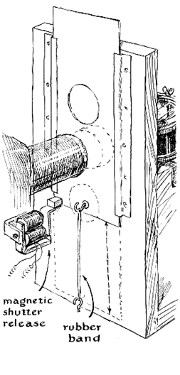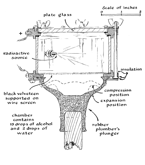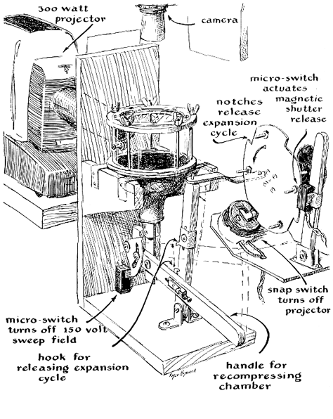 "These tracks," says Hull, "were photographed with the aid of a 'plumber's friend' cloud chamber-an arrangement assembled from odd parts from the junk box. Like the 'peanut-butter jar' chamber that you described, the plumber's friend can be constructed in a single evening. The basic idea stemmed from a chamber of the rubber-bulb compression type popular for classroom demonstrations. Although the rubber-bulb instrument is satisfactory for a visual demonstration, trouble was encountered when we attempted to photograph tracks with it. Compressions could not be reproduced uniformly, nor could we time the exposures correctly. Various alternate arrangements were tried until it occurred to us that the plumber's friend- a rubber plunger of the kind used for clearing drains-might work. In the cloud chamber it does not operate strictly as a piston does, of course, because the center of the plunger moves a greater distance than the edges. As a result the particle tracks are distorted somewhat; nevertheless we are delighted with the performance of the arrangement and have made hundreds of excellent pictures. "The side walls of the chamber are cut from a quart glass jar by the hotwire method. You wrap a single turn of iron wire (such as that used for binding brooms) around the jar tightly at the place where the cut is desired, the ends being separated by a small sheet of asbestos insulation where they would otherwise make electrical contact. The loop becomes red hot when you connect it across the six-volt terminals of a transformer or storage battery. After about 30 seconds of heating you remove the wire. Plunge the jar into cold water immediately. The glass will break cleanly at the line where it was heated by the wire. The sharp edges are then rounded with abrasive such as emery or carborundum. "The top of the chamber is closed by a plate-glass window [see Figure 6]. If you do not own a circular glass cutter, one can easily be rigged from a wheel-type cutter available in hardware stores. Fasten the wheel end of the cutter to one end of a short length of inch-square wood so that the wheel protrudes slightly beneath the lower edge of the wood. Next drive a wood screw through the wood vertically at a distance from the cutter wheel equal to the radius of the desired glass disk. The protruding tip of the wood screw serves as the center point of a compass, the wheel as the other point. Then make an indentation with a center punch in a small scrap of 16-gauge sheet metal. You place this punched piece of metal on the glass to be cut, backing the metal with friction tape to prevent it from slipping. The punched indentation is centered with respect to the glass. Now you put the protruding tip of the wood screw in the indentation and make a circular cut in the glass with a single, firm rotary stroke of the tool. After this, if you make 10 straight radial cuts from this disk to the edge of the glass sheet, you can break away the outer pieces, leaving a disk the same size as the circular cut. You then smooth the edge of the disk with abrasive. "The glass cylinder, window and plumber's friend are fastened together with metal rings [see drawing below]. The ring fittings can be built of thin sections cut from sheet metal and soldered. If a metal cutting lathe is available, you can machine them from a thick slab of stock. Rubber gaskets must be inserted where the metal and glass come into contact. Turbulence in the chamber is minimized by inserting a disk of black velveteen, supported by wire screening, between the cavity of the rubber plunger and the chamber. The radioactive sample is supported inside the chamber by a machine screw inserted through the side wall. "The assembled chamber is supported on a wooden bracket. Its expansion is actuated by a lever mechanism, which is tripped by a motor-driven cam. The chamber is illuminated by a 300-watt slide projector, the beam of which is controlled by a shutter released electromagnetically. The camera is positioned above. "To make the compression stroke you lift the horizontal lever quickly and hook it to the vertical lever [see Figure 6]. The compression should not exceed about one third of an atmosphere, or the chamber will fill with fog on expansion. After about 30 seconds you start the motor. The cam advances until the metal arm at the top of the vertical lever drops into a notch on the cam. A spring then pulls the vertical lever away from the chamber, unhooking the horizontal lever. The plumber's friend then springs to its original shape, accomplishing the expansion stroke. "An electrostatic 'clearing' field is applied to the chamber automatically during the compression stroke by a microswitch actuated by the horizontal lever. The field is removed by the switch and the leads to the chamber are short-circuited automatically at the end of the expansion stroke. Similarly, the motor-driven cam is equipped with switches for operating the projector and shutter release in sequence. Exposure time is fixed by the tension of a rubber band hooked to the shutter [drawing at lower left]. "The proportion and amount of liquid in the chamber are not critical. Good tracks form with either 180-proof grain alcohol or rubbing alcohol as it comes from the bottle. Performance is influenced by room temperature, however. Above 70 degrees Fahrenheit results are improved by diluting the alcohol slightly with water-say 15 drops of alcohol to two drops of water. It should be kept in mind that fog results from too much liquid as well as from over-expansion. The chamber rarely requires more than 20 drops of liquid. Don't expect to see tracks during the first few expansions. The liquid must have time to evaporate. "Beta tracks, being thin, are more difficult to see than alphas and appear best when the alphas have faded. It is interesting to investigate the penetrating power of particles through thin sheets of various materials. The chamber also enables you to experiment with various other atomi