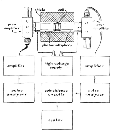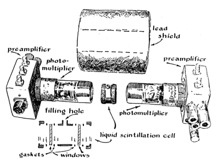 "I follow the simpler method, working with carbon dioxide rather than carbon The dried carbon dioxide is bubbled through a three-necked flask containing methyl magnesium iodide, with which the gas reacts to form acetic acid as shown [see Figure 3]. The gas enters through one neck, a Stirring rod to agitate the fluid is introduced through u second neck, and unreacted gas escapes through the third neck. The escape neck is fitted with a drying tube to prevent entry of water vapor from the air into the flask. If the chemical steps have been taken with care, the specimen, now in the form of clear acetic acid, is free of all radioactive substances except the original carbon 14. It is bottled promptly to prevent contamination. "The scintillation cell of my counter consists of a pipe nipple about an inch long and two inches in diameter. The ends are closed by glass windows held in place by a pair of internally threaded bezels. The inner wall of the cell is coated with a special white paint impervious to the scintillation fluid. The fluid itself consists of toluene with four tenths of 1 per cent of diphenylaxazole and 20 parts per million of diphenyloxazolylbenzene, the latter chemical serving to shift the color of the scintillations to the portion of the spectrum to which the cathodes of the phototubes are most sensitive. The cell is filled through a small entrance tube in the side [see drawing in Figure 4]. The scintillation fluid has the property of fluorescing when excited by the emission of radioactive substances as well as by light and other radiations. "The scintillation cell is shielded from the background by a tube of lead three inches thick. How to lay hands on that much lead had me stumped for a while. Then I learned that a manufacturer of toothpaste tubes lives in our neighborhood. I introduced myself, and when he learned about the project he not only supplied the lead but cast the shield for me. The shield reduces the effect o background radiation by about 80 per cent. The rest, and 'noise' from the electrical system, must be suppressed electronically. "The scintillation cell is sandwiched between a pair of photoelectric cells the photomultiplier type, consisting of a photocathode plus a self-contained amplifier. Each scintillation triggers a substantial pulse of current, which appears at the output terminal of each photomultiplier. Electrons dislodged from the cathode by heat cause similar pulses. These are minimized by refrigerating the entire pickup assemblythe scintillation cell, the photomultipliers, the preamplifiers and the lead shield. I talked my mother into locating the family's food freezer' in my corner of the basement. The compartment assigned to me holds the pickup assembly at 20 degrees below zero centigrade. "A number of tricks have been developed for reducing background electronically. One takes advantage of the fact that scintillations created by the disintegration of carbon-14 atoms are fairly uniform in brightness. Flashes touched off by other forms of radiation vary in intensity over a wide range. Only a few of them coincide in intensity with the flashes of the carbon 14. The electrical pulses that appear at the output terminals of the photomultipliers vary in proportion. A circuit has been designed which favors the pulse size of carbon 14. It employs a set of vacuum tubes controlled by the signals from an auxiliary circuit. The size of each pulse is measured as it enters the device and is the routed into a branch circuit called u delay linea kind of electrical blind alley. In the meantime the charge on the grids of the vacuum tubes is being adjusted in accordance with the measurement so that the tubes will conduct or not conduct according to the size of the pulse. The control action is timed for completion just prior to the instant the pulse returns from its side trip. Only those pulses meeting the specification get through. A significant number initiated by sources other than carbon 14 pass muster, however. "Most of the remaining background is blocked out by a screening device of a somewhat different sort. The scintillation cell is watched by a pair of photomultipliers. After amplification, the current pulses from the two photomultipliers, screened by the previous device to uniform size, are presented to a 'coincidence' circuit. Essentially this is a pair of electric 'check valves,' or diodes, comprising the input circuit of an amplifier designed to ignore pulses of current below a predetermined minimum size. The pulse from a single photomultiplier is not energetic enough to activate the amplifier. Therefore the circuit is activated only when a pair of pulses from the photomultipliers arrive simultaneously. Thus only pulses generated by flashes in the scintillation counter, where the pair of watching photomultipliers is triggered simultaneously, gain admittance to the electromechanical counter. "By these various methods I have reduced the spurious counts in my instrument to about 25 per minute. My equipment contains some 80 vacuum tubes and cost somewhat more than $1,000. "In dating an archaeological specimen the counting equipment is first calibrated. A measured quantity of standard fluid is mixed with the scintillation fluid and put into the cell. The cell, the shield, the photomultipliers and the pre-amplifier assembly are refrigerated overnight. I then operate the counter for 48 hours, take the accumulated reading, reduce it to counts per minute and compute the efficiency. Having established this, I remove the cell, clean it scrupulously and proceed to measure the activity of the actual sample. The difference between the count of modern carbon and that of the specimen provides the basis for computing the unknown date. If the calibration step can be omitted, as is the case when you are working with a series of specimens, you can date an average of about one specimen per week if everything goes well. It rarely does. Without the help and encouragement of a lot