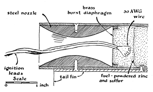 "Both the 'A' and 'B' rockets employed zinc dust mixed with powdered sulfur as a propellant. First we thoroughly stirred a mixture of 85 per cent zinc to 15 per cent sulfur. Then we used one of two methods of loading the propellant. In the first method we poured the powder into the nozzle of the steel tube in small amounts, lightly tamping each added amount by jouncing the rocket. In the second method, which is more effective but less convenient, the powder is packaged in small cardboard cylinders, the ends of which are closed with tissue paper. These cartridges, each of which contains the same weight of powder, are loaded into the combustion chamber end to end. The second method has the advantage that every rocket loaded in this way has nearly the same thrust. It has the disadvantage that the nozzle must be removed during loading. In both methods of loading the powder is set off by an electrical ignition unit embedded in the last batch of powder to be added. "Both 'A' and 'B' rockets were launched from a tower made of angle sections and strap iron. Clips attached near the top and bottom of the missile ride on a launching rail welded to a corner of the tower. The rockets were fired by remote control from an observation bunker located 50 yards from the tower. The bunker was constructed of heavy timbers and covered by several feet] earth; observation slits were cut in the wall facing the tower. All firings were conducted in a rural mountain area. None of the missiles functioned perfectly in every respect; some were down right failures. This is the usual situation in amateur rocketry.