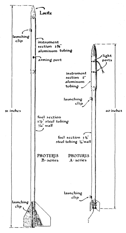 "A third pioneer group is the British Interplanetary Society. The day when man will achieve space flight has doubtless been substantially retarded because the law in England forbids laymen to experiment with rockets. The British Society's gifted members have, however, continuously published a fine journal devoted to space flight and allied subjects. "The outbreak of World War II interrupted the work of all rocket societies Then, in 1943, George James of Glendale, Calif., founded the Southern California Rocket Society, later renamed the Reaction Research Society. At about the same time the Chicago Rocket Society was organized. These turned out to be vigorous groups, and interest in rocketry has been growing ever since. The Reaction Research Society staged a number of successful mail flights by rocket in an effort to emphasize the peaceful use of the art. The lack of adequate space for testing prevented the Chicago group from undertaking comparable experiments. Nonetheless an impressive number of ideas and much useful data have come out of its program of theoretical work. "Representative groups formed since 1943 include the Pacific Rocket Society, the Philadelphia Astronautical Society, the M.I.T. Rocket Research Society, the Intermountain Rocket Society; the Boise Rocket Research Society, the Society for the Advancement of Space Travel and our Reaction Missile Research Society, Inc. All are affiliated with the American Astronautical Federation, formed as a national organization to collect and distribute information and to promote space flight. Numerous other groups are now in existence; it is hoped that a complete roster of rocket societies can soon be compiled." (Any recently formed group may forward its address to this department for listing.) "Amateur rocketry has a variety of attractions beyond the spectacular but short-lived flight of the rocket. The design and construction of the missile, its launching apparatus and instrumentation pose many intriguing problems. The rocket must be aerodynamically stable both before and after burnout; this problem of stability can be attacked in many ways and invites endless designs and tests. The design of small motors and special propellants can challenge a sophisticated knowledge of mathematics, physics and chemistry. Because of space limitations the instrumentation of small rockets calls for great ingenuity; it should appeal to radio amateurs, particularly those interested in miniaturization. Similarly, amateur photographers always find a ready-made welcome in rocket societies because pictures are needed of take-offs, flight paths, instrumentation records and the apparatus before and after firing. Being a member of a team that coordinates so many fields of interest in carrying a program through to the climax of firing a rocket with instrumentation gives one a feeling of pride in accomplishment with few parallels. "Members of amateur rocket societies have no illusions that true space flight will be achieved through their efforts. They have neither the funds nor access to the necessary materials. But they can acquire first-hand information concerning the nature of the problems now awaiting solution. By exchanging information and undertaking certain types of experiments beginners can learn the basic facts of rocket flight. Finally, rocket enthusiasts can help enlist public support for such national efforts as the project to launch artificial satellites of the earth. "A relatively elementary project undertaken recently by the Reaction Missile Research Society illustrates the sort of experimental work appropriate for beginners and points up some of the tribulations which the amateur rocketeer learns to take in stride and enjoy. The project was conceived by Walter La Fleur, who was then doing graduate work in mathematics at the New Mexico College of Agriculture and Mechanical Arts. The purpose of the project was to record information on the trajectory of a rocket by means of a light source carried in the missile. Incidentally, amateurs enjoy naming their rockets. La Fleur's was to carry a flashing light, so the idea of calling it Firefly was proposed. It turned out that another group had used the same name, so we dubbed ours Photuris' a classical word for firefly. Our 'A' series was a low-cost program, each missile setting us back about $9. Series 'B' involved electronic instrumentation and each rocket cost $50. In order to record the flight information under the best photographic conditions, all firings were made on moonless nights. "The Photuris A basically consisted of a thin-walled steel tube of 1 l/4 inches inside diameter to which a 2-inch aluminum tube was attached by means of a reduction fitting. The steel section carried the fuel and was fitted with a convergent-divergent nozzle and fins, as shown in Roger Hayward's drawing in Figure 1. The aluminum tube housed the rocket's instruments and was closed at the top by a wooden nose-cone. A compartment at the top of the instrument section was charged with fusee powder, which burns with a brilliant red light. The powder was ignited electrically by passing a heavy current through a fine Nichrome wire buried in it. The lower compartment of the instrument section was fitted with a miniature photoflash lamp, a pendulum switch and a battery supply. The principle of the switch was being tested as a possible means of releasing a parachute in future missiles. The switch was designed to close when the missile turned over at the top of its trajectory. A record made by the photoflash bulb would prove or disprove the merit of the idea.