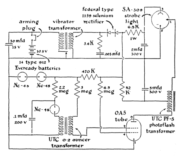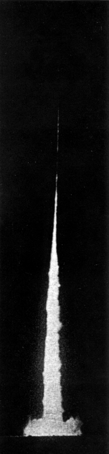 "In the case of Photuris 1-A the motor did not function properly. At 'fire' the fuel ignited and burned for about 10 seconds. The rocket left the launcher slowly, climbed about 30 feet, nosed over and struck the ground with the motor still burning. Subsequent inspection disclosed that two hot spots had developed in the combustion chamber, and that about a pound of propellant had failed to burn. Reasons advanced for the malfunctioning included the suggestions that ( 1) the fuel had not been packed properly, (2) that during transportation to the test area the propellant had moved away from the walls of the chamber causing erratic burning, (3) that the constituents of the propellant had not been mixed in proper proportion and (4) that the burst diaphragm had not been strong enough. The burst diaphragm temporarily closes the combustion chamber so that pressure can build up within it The diaphragm thus establishes the rate at which the propellant burns. If the diaphragm bursts too soon, the burning rate will be low at the outset and the rocket will not rise from the launcher promptly. Because the tail fins of the rocket will not stabilize it effectively at low speed, the rocket will thus be aerodynamically unstable during the early part of its flight. The next morning we ran two static tests which proved that the burst diaphragm had in fact been at fault. A thin diaphragm employed in the first static test resulted in a performance identical with that of the previous night: slow burning and a remainder of unburned fuel. A heavier diaphragm used in the second static test resulted in perfect burning. "Photuris 1-A not only had motor trouble; its instrumentation section also behaved badly. The signal flare did not ignite properly, the lower end of the wooden nose-cone burned away ( although supposedly protected by a layer of asbestos insulation ) and the ports provided for flare exhaust appeared to be too small. The pendulum switch apparently worked. Two observers reported seeing a flash as the missile turned over at the top of its trajectory. "Following our tests Photuris 2-A was fitted with a stronger burst diaphragm. A low-current relay system was installed to improve the ignition of the signal flare. The flare section was provided with larger exhaust ports, and both the top and bottom of the flare compartment were fireproofed with a thick layer of plaster of Paris. "The time required for these changes, other activities of the Society and unfavorable weather delayed the next test for about two months. Finally the big night came and we threw the switch. The motor refused to fire. Investigation revealed that the propellant in contact with the ignition filament had fused into hard pellets. The combustion chamber was emptied, repacked and fitted with a new ignition element. At the second firing the burst diaphragm ruptured and released a short tongue, of flame. The missile did not move from the launcher. Suddenly the wall of the combustion chamber near the exhaust nozzle became red hot and the red area moved slowly toward the nose of the rocket. Subsequent chemical analysis of residue within the combustion chamber disclosed an excess of zinc in the propellant. We changed the fuel mixture to 75 per cent zinc and 25 per cent sulfur. ''Photuris 3-A was fired successfully one week later. The instrumentation was the same as that in previous tests. We did not, however, attain our objectives. The flare went out during acceleration. doubtless because its powder had not been properly mixed. The flash bulb failed to operate when the rocket turned over; a subsequent check showed that its supposedly 'new' batteries were dead As a final contribution to our dismay the rocket shed its fins after three quarters of a second at an altitude of about 75 feet! The total burning time was about one second. The main body of the missile landed 300 feet short and north of the predicted impact area a quarter of a mile away. The divergent section of the exhaust nozzle was badly eroded. "Despite these failures the group felt it had acquired enough experience with zinc-sulfur propellant to risk the construction of a larger missile with more elaborate instrumentation. Accordingly we began to work on the first of the Photuris B missiles. The propulsion section was made of steel tubing 1/16 inch thick, 57 inches long, and with an inside diameter of 1 3/8 inches. It was equipped with three parallelogram-shaped fins with a 60-degree angle of sweepback. The rocket weighed 8.75 pounds empty and 15.4 pounds fueled, a mass ratio (empty weight to fueled weight) of 1:1. The fuel mixture was 75 per cent zinc dust and 25 per cent sulfur. The exhaust nozzle was a 30 degree convergent-divergent double cone of steel. "The instrumentation consisted of a high-brilliancy xenon strobe lamp, a power supply and an associated electronic timing-circuit designed to trigger the lamp at a rate of five flashes per second. Photographs of the flashes, which were bright enough to record on film from a distance of three quarters of a mile, were meant to chart not only the flight path but also to enable us to compute the missile's velocity, its total flight time, its acceleration at any point on its trajectory and so on. "Providing a direct-current source of 300 volts and .008 amperes for the lamp in the small space available turned out to be a major headache. Because batteries of the desired voltage and current rating were not available, we decided to use flashlight batteries and step up their voltage by a vibrator power-supply of the type used in automobile radios. A series of tests were first run to ascertain if the flashlight batteries could deliver enough power to drive the lamp and associated circuitry for the estimated flight time. A large number of three-minute, high-current tests were run on four brands of flashlight batteries available in local stores. We learned in these tests that although the small batteries used in pen-sized flashlights have abo