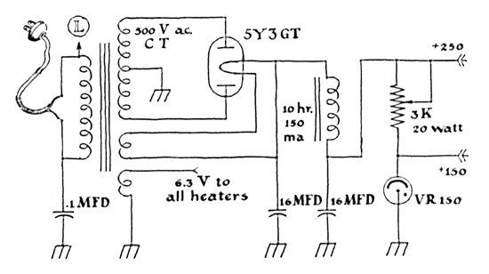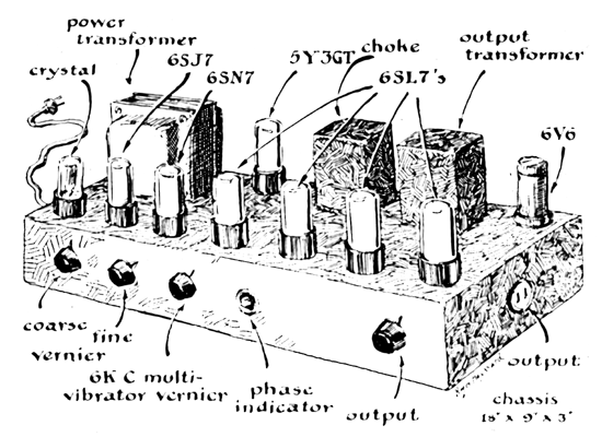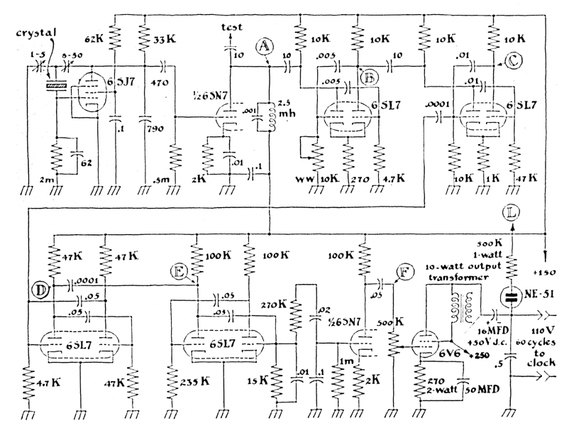 "The output of one multivibrator can trigger another. Four properly adjusted, units can thus reduce the frequency of a cycle oscillator in steps of 6,000, 1,200, 240 and finally 60 cycles. In the case of clock the 120-kilocycle signal is derived from the stable crystal oscillator. The 60 cycle output of the final multivibrator is filtered and amplified to 110 volts to drive the electric clock. "It must be confessed at this point ./that the free-running period of multivibrators is influenced by many factors: the voltage of the plate supply, cathode temperature, humidity, atmospheric pressure. And even, I have had reason to, suspect, the state of ones ulcers. The 6,000 unit is so sensitive to triggering influences that it is apt to lock in step with every disturbance that chances along. It has a revolting way, for example, of deciding to count every 19th pulse or every 21st instead of the desired 20th. This does not mean that multivibrators are too tricky for the beginner. It seems humane, however, to suggest that prospective builders of the clock should lay in an extra supply of aspirin. Fortunately none of the problems are difficult to diagnose. Any amateur with patience enough to make a parabolic mirror will find this project less exacting. One can make major changes in the components at any point, or even start from scratch again without losing anything but time After all, what fun would one get out of making a piece of gear which behaved well on the first try? "The layout of the parts on the chassis is not critical. The second tube of the line-up, the BSN7 twin triode, should be installed with-some care. This tube plays a dual role, half :of it acting as the preamplifier for 120 kilocycles and the other half as the preamplifier for 60 cycles. Hence it may well be placed next to the oscillator, where it can be fed with short, direct connections. The 60-cycle half can be fed without ill effect by any convenient length of wire. Any method of wiring is satisfactory, provided it does not complicate the task of changing resistors and capacitors in the various multivibrators. The multivibrator circuits must be tailor-made. The values of the resistors and capacitors [specified in the circuit diagram in Figure 2] are only approximate. They work in my clock, but may not in someone elses. "When the chassis has been wired, checked and the tubes installed, it is necessary to set the 150-volt regulator tube under load for a current of 25 milliamperes. One safe method is to place a temporary 100-ohm resistor in series with the ground side of the regulator tube and adjust the variable 20-watt resistor (beginning at about 2,000 ohms) until a voltage of 2.5 is read across the 100-ohm resistor. This method sidesteps the possibility of damaging a milliammeter, should the circuit be accidentally shorted during adjustment. The output control in the grid of the 6V6 power amplifier should be set at minimum while the multivibrator stages are being tamed. "It is possible to adjust the free-running period of the multivibrator by ear. A headphone (connected through an isolating amplifier) would enable one to hear the tone and judge the frequency of their respective outputs. But a cathode-ray oscilloscope is by far the best tool for the job. If the amateur does not own an oscilloscope, he may be able to interest a nearby television repairman in the project sufficiently to get the use of oneor even persuade the repairman to try the adjustment. "The oscilloscope is used to examine the wave forms, and hence the relative frequencies, of two sources of oscillation at a time. Before the tests are begun, one lead of a 1-megohm resistor (of the quarter-watt size) is tightly wrapped to the tip of each of the oscilloscopes two test-probes, one of which causes vertical deflections to be displayed and the other horizontal deflections. The free end of the resistors are thereafter used as probe tips. The tests are based on the pattern presented by the scope when its inputs are fed with frequencies related in integral ratio, such as 4 to 1, 20 to 1 and so on. When the frequencies are in exact integral ratio, the resulting pattern is one of the well-known Lissajous figures. If the horizontal swing of the scope makes one complete oscillation, for example, while the vertical deflection makes two or more, the pattern may look like a misshapen crown they are a number of vertical teeth around its upper edge. If the teeth drift a little, the ratio of the two frequencies under observation is nearly but not precisely integral. "The testing and adjustment procedure may be a bit tedious, but it is not difficult. The probes of the scope are applied to a pair of frequency sources, the pattern is observed and the circuit modified as dictated by the pattern. The sources of frequency to be examined are designated by lettered test points [see Figure 2].
