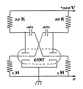 "Pulses also appear as a charge on the respective grids. There is a somewhat stronger pulse on one grid than on the other because multivibrator circuits cannot be made perfectly symmetrical. A heavy flow of current promptly builds up in the plate circuit of the tube receiving the stronger pulse. The grid of the companion tube, being coupled to the plate of the conducting tube, is driven strongly negative and soon reaches the point of blocking the flow of electrons from the cathode of the conducting tube to its plate. The tube is said to have passed the cutoff point. The negative charge on this grid (and on its associated coupling capacitor) then leaks off through a resistor connected between the grid and cathode. The time required for the leaking process depends on the size of the coupling capacitor and the resistor. As the charge leaks away, the potential of the grid rises toward the cutoff point (beyond which the tube can conduct). When this critical point is reached, the tube promptly conducts. The resulting pulse drives the grid of the companion tube (through the coupling capacitor) strongly negative and it in turn cuts off. Thereupon the series of events repeats. The negative charge leaks off the grid and a new cycle is initiated. The seesaw action continueseach tube being cut off and cutting off its companion in return. One grid or the other is always negative and one always positive. Alternately one tube conducts and the other tube does not. "The frequency at which a multivibrator performs this automatic flip-flop can be increased somewhat without changing the size of the coupling capacitors or grid-leak resistors. If, as either grid approaches the point at which conduction is about to be resumed, a pulse is applied to the grid from an external source, conduction will be initiated early. An external pulse of proper sign (positive) will neutralize the remaining negative charge and push the grid over the-top., The multivibrator owes its action as a frequency divider to this effect. Frequency division is accomplished by setting the multivibrators natural or free-running frequency close to but slightly lower than the desired submultiple of signal frequency and then introducing the signal or controlling frequency to the grid of one of the two multivibrator tubes. The multivibrator then locks in step at the desired submultiple of the signal frequency, because one and only one pulse of the signal can arrive at the critical moment the triggering grid is approaching the cutoff point. Other signal pulses arrive while the grid is either strongly negative or during alternate half-cycles when it is charged positively. Thus if a controlling signal of 120 kilocycles is coupled to one grid of a multivibrator which is adjusted for a natural period of slightly less than 6,000 cycles, the first nine cycles of the signal occur while the triggering grid is substantially below the point of conduction. The 10th cycle, however, arrives just in time to push the grid over the top and initiate conduction. During the next 10 signal. pulses the triggering grid is positive and the signal has effect. At the end of this interval the companion tube conducts automatically and drives the triggering grid negative in preparation for the next cycle of events. Thus each 20th pulse of the signal triggers the controlled tube into conduction, and the multivibrator accordingly oscillates at a 20th of the signal frequency.