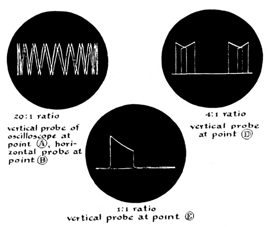 "The testing routine begins with the 6,000-cycle multivibrator. First place the vertical test-probe of the scope on point A, the output of the 120-kilocycle oscillator, and the horizontal probe on point B, the output of the 6,000-cycle (we hope) multivibrator. Remove the 6SL7 tube from the succeeding 1,200-cycle multivibrator. Adjust the gain controls of the scope for a pattern of convenient size. Now rotate the variable grid resistor (10 K) of the 6,000-cycle multivibrator to produce a stationary pattern on the scope. Several such points will doubtless be found. Select one for examination. Adjust the - gain control of the scope for full deflection and count the teeth in the pattern. With luck, the count will be 20 [see drawing left]. If the count is higher or lower, select another of the stable points and count again. If none of the settings yields the desired count of 20, the value of the 4.7-K resistor in the grid circuit of the second multivibrator ,tube must be altered. Remove the 4.7-K resistor and substitute a rheostat for it. (One made of a 100-K potentiometer will do. ) Now set the 10-K variable grid resistor of the first tube to its midpoint and vary the rheostat. Increased resistance will lower the multivibrator frequency, causing more: peaks to appear, decreased resistance will do the opposite. A setting will be found which yields the 20 stationary peaks desired. Measure the value of the rheostat with an ohmmeter, select a corresponding fixed resistor close to this value and substitute it for the rheostat. Replacing the rheostat with the fixed resistor will alter the circuit enough to change the count, but a setting of the variable 10-K resistor should now be found that will restore it to 20. "Replace the tube previously removed from the 1,200-cycle multivibrator and remove the corresponding tube from the 240-cycle unit. Put the vertical probe on point C and the horizontal one on the ungrounded side of the heater circuit at any convenient point. This feeds the horizontal sweep of the scope with the frequency of the power line. If the second multivibrator is oscillating at the desired 1,200 cycles, the scope pattern will again show 20 teeth. A slow rotation of the pattern will doubtless be observed, indicating that the power-line frequency is not a precise multiple of the crystal frequencynot quite the 60 cycles customarily advertised. If, in contrast, the pattern shows a pronounced vertical deflection and moves rapidly, substitute the rheostat (just removed from the 6,000-cycle multivibrator) for the 10-K resistor in the grid circuit of the first tube of the 1,200-cycle multivibrator. Again verify the frequency of the 6,000-cycle unit. Now vary the rheostat to produce the 20-tooth pattern, with perhaps the slow rotation mentioned (the vertical probe of the scope being on point C and the horizontal one on the ungrounded heater circuit). Measure the value of the rheostat setting which yields a count of 20 and replace the rheostat with a fixed resistor of this value. Again verify the operation of all units of the assembly to this point. The adjustment procedure is similar for the remaining units. In each case, while a, unit is being adjusted, the first tube of the following unit must be removed from its socket. The horizontal probe of the scope remains on the ungrounded side of the heater circuit while the 1,200-, 240- and 60-cycle units are adjusted. The vertical probe is placed at point D (the output of the 240-cycle unit) and the 47-K grid resistor adjusted until the pattern shows four peaks. Similarly, with the vertical probe at point E (the output of the 60 cycle unit), alter the 15-K grid resistor (of the second tube) for a pattern displaying a single peak. Finally, place the vertical probe on point F (the output of the 60-cycle preamplifier). The pattern should now take the form of a smoothly rotating ellipse which slowly changes into a straight line at one extreme and opens into a circle at the other.