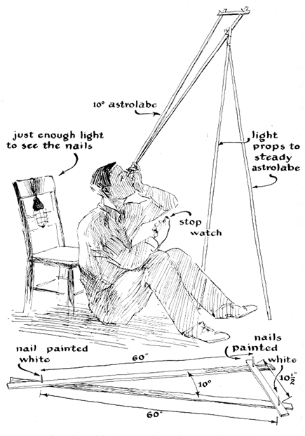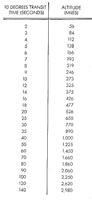 "In the case of our measurements of the first satellite," write Lovberg and Burkhardt, "we used a conventional Hallicrafter SX-28 receiver at 40 megacycles. The local beat-oscillator was left off and a surplus BC-221 frequency meter was coupled loosely (by means o a twist of insulated wire) to the antenna lead. The signal generator is set at approximately 3,000 cycles below the satellite frequency when the 'little traveler' is first detected. This results in an audible tone in the receiver output. The tone is now fed into a loudspeaker together with the output of an audio oscillator. In a typical run one sets the audio oscillator to a tone lower than that of the satellite, say 2,500 cycles per second, and waits for the satellite tone to drop to the same value. The zero beat between the two tones is first heard as a fluttering sound which diminishes in frequency to a slow swelling and fading of the 2,500-cycle note. At the instant the tone becomes steady, one records the time as well as the frequency (2,500 cycles in this instance) and quickly shifts the audio-frequency oscillator to, say, 2,400 cycles, and waits again for the matching of the tones. "The resulting table of frequencies and times is then plotted as a curve like the one shown on page 102. This indicates the passage of the first satellite over Los Alamos, N. M., on October 18. Next we draw a line tangent to the curve at its steepest point. The slope of the tangent line represents the number of cycles per second that the frequency changes per second and varies in proportion to the distance of the satellite. If we call this slope m, then the distance of the closest approach of the satellite is given by the simple formula d = fv2/cm. Here f equals the frequency of the satellite's transmitter (40 megacycles), v equals the velocity of the satellite in miles per second (about 4.9 miles), c is the speed of light in miles per second. The velocity v will vary somewhat from the 4.9-miles-per-second value, depending on such factors as the eccentricity of the satellite's orbit. The amateur may obtain fairly accurate velocity figures from agencies such as the Smithsonian Astrophysical Observatory. These figures are sometimes reported in the daily press." It was by this method that Lovberg and Burkhardt learned that the first satellite was coming over Los Alamos at a height of about 170 miles at night and 260 miles during the day. The figures are in good agreement with those released by the Smithsonian Observatory. An optical means of getting the same result is suggested by Walter Chestnut, a physicist at Brookhaven National Laboratory: "If an object is in a stable, circular orbit around the earth, one may say that the gravitational force of the earth pulls the object with a force which equals its centrifugal force. The relation may be expressed in mathematical terms in such a way that the object's altitude may be determined by a simple measurement of the number of degrees traversed by the satellite in one second as the object passes overhead. This angular velocity may be measured by timing the transit of the satellite as it passes stars, the positions of which are known. If the amateur does not have a star chart, the angle can be easily measured by a fixed astrolabe, a triangle of wooden slats nailed together and supported as shown in the accompanying illustration [at right]. The astrolabe forms an angle of 10 degrees. The nails serve as sights; they should be painted white so that they will be clearly visible in poor illumination. The construction of the instrument should be as light as possible, because it must be swung into position quickly when a satellite is spotted. The two outer nails should be placed in line with the satellite's path and held steady. The number of seconds are then counted from the time the object appears to touch the first nail until it reaches the second one. The corresponding altitude in miles can then be read from the accompanying table [see below]. "Readers may calculate their own table for astrolabes of other angles by the equation: In this equation d1 equals the altitude of the satellite in miles; t is the time of transit in seconds for an angle of a degrees. For an astrolabe of 15 degrees and a transit time of 60 seconds the altitude would be or 1,128 X .8474(956) miles. The same calculation is carried out for each value of time desired in the table. "Both the table and the equation assume that the satellite is observed within 15 degrees of the zenith. If the satellite is more than 15 degrees from the zenith, multiply the distance given in the table by the cosine of the angle between the orbit and the zenith. The equation and table also assume that the orbit is a circle. Most orbits, however, will be ellipses. But if one knows the maximum and minimum heights of the satellite, the table (and equation) can be corrected for ellipticity by the equation: In this equation d1 is the altitude obtained from the table (or the first equation). C is the distance (in miles) to be added to d1 if C is positive, or to be subtracted from d1 if C is negative. The average of the maximum and minimum altitudes of the satellite is represented by de. In the case of Sputnik I the maximum and minimum altitudes were respectively 570 and 170 miles; de accordingly equals 370 miles.