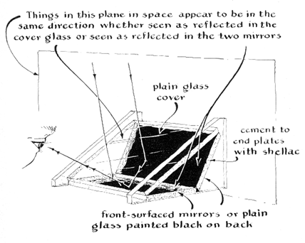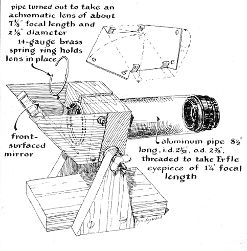 Most satellite observers will also want a good low-power, wide-field telescope. An inexpensive one of the type used by Moonwatch teams is depicted below. It is designed for table-top use, the front-surfaced mirror being an anti-crick-in-the-neck feature for those who prefer to look down rather than up. The achromatic objective lens and Erfle eyepiece together retail for about $25. Roger Hayward, who makes the drawings which illustrate this department, is a restless intellect. Between assignments for "The Amateur Scientist" he is an architect, but he still finds time for multifarious activities ranging from the design of optical instruments to the making of decorative mobiles. One of his recent concerns has been to devise experiments which demonstrate the remarkable properties of the human eye. "During the past few days," he writes, "I have been enjoying a brainstorm which might amuse other amateurs. It all started when I came across the description of an ingenious optical trick involving a mirror polished on the flank of a contact lens arranged so-the observer's eye is presented with an image of a dark vertical line which remains fixed on the retina regardless of any eye movement. The general result of the experiment was that the image of the line kept disappearing. The image would be observed with distracting clarity for about a tenth of a second. Then it would disappear, reappearing now and then at irregular intervals. The conclusion was drawn that if any image is presented continuously to the eye without any relative motion with respect to the retina, the mind simply learns to ignore it. Although not specifically mentioned in the article, this sort of thing brings to mind the fact that visual acuity is greater for moving objects than for fixed ones.