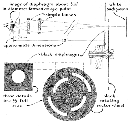 "The setup required for perceiving the network of blood vessels and nerves in your own eye involves somewhat more elaborate apparatus, but even so it is simple enough to suit most amateurs. A rotating disk with slots, or merely a disk painted black and white and masked by an aperture [see Figure 8], is focused on the pupil of the eye. In effect the image created by the dark part of the disk alternately covers the two sides of the pupil, while the white portion alternately admits light to each side. Any lens system will serve to focus the image of the source on the pupil, such as a conventional eyepiece or even a pair of pocket magnifiers held together with rubber bands. An eye ring is handy for locating the eye point in space. This can be made from a narrow strip of cardboard as shown in the drawing. The painted disk should be turned at about 10 or 15 revolutions per second. I accomplished this with a hand-cranked pulley only because I did not happen to have a slow-speed motor at hand. "The image of the network leaves something to be desired in the matter of contrast. Even with the 1Rickering light the obstructions are not too easy to see. The silhouette appears as little more than a texture. A number of details disappear and reappear at irregular intervals and are about as distinct as the small objects which appear and disappear, seemingly out of nowhere, when the gaze is fixed on the sky or a smooth surface without observable detail. Some of these, incidentally, are blood corpuscles.