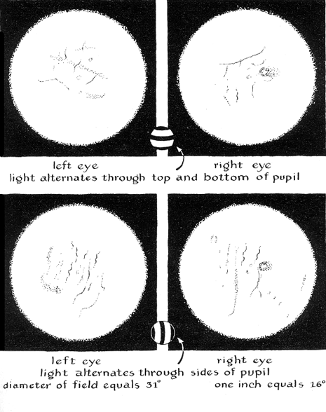 "It has also been observed that the human eye is always in motion. An irregular vibratory motion of from 5 to 25 seconds of arc inamplitude and from 10 to 100 cycles per second in frequency seems to be ever present, and appears to be necessary to maintain consciousness of the background scenery. It is also well known that the retina is crisscrossed by a many-layered network of nerves and blood vessels which cast shadows on the light-sensitive cells. Yet we are not conscious of this complex obstruction between the lens and retina. According to physiologists the network which overlies the light-sensitive cells is about a thousandth of an inch thick. "This is where I come in. It seemed to me that if one could present the eve with a view of a uniform field of light, one without any detail, and arrange matters so that this view is perceived by light which would come alternately through the two sides of the pupil of the eye, then shadows cast by the blood vessels, nerves and so on could be made to fall alternately on different light receivers, and the flickering shadows would be perceived because of their movement. One would in effect see a vibrating silhouette of the obstructing network in his own eye.
