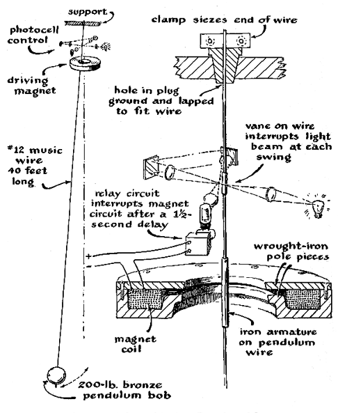 In the year 1543 Nicolaus Copernicus had sent a copy of his new book, On the Revolutions of the Celestial Orbs, to pope Paul III with a note containing a historic understatement: "I can easily conceive, most Holy Father," he wrote, 'that as soon as people learn that in this book I ascribe certain motions to the earth, they will cry out at once that I and my theory should be rejected." Cry out hey did, and some, including a few scientists, were still crying out in 1850, when Foucault was invited to stage a science exhibit as part of the Paris Exposition scheduled for the following year. Being not only a gifted physicist but also something of a showman, he selected as the site of his exhibit the church of Sainte Genevieve, also known as the Pantheon. From the dome of the Pantheon he hung a pendulum consisting of 200 feet of piano wire and a 62-pound cannon ball. On the floor, immediately below he cannon ball, he sprinkled a layer of fine sand. A stylus fixed to the bottom of the ball made a trace in the sand, thus recording the movement of the pendulum. Great care was taken during construction to exclude all forces except those acting vertically to support the system Tests were even made to assure symmetry in the metallurgical structure of the wire. Finally the ball was pulled to one side and tied in place with a stout thread. When the system was still, the restraining thread was burned. The pendulum made a true sweep, leaving a straight trace in the sand. In a few minutes the thin line had expanded into a pattern resembling the outline of a two-bladed propeller. The pattern grew in a clockwise direction, and at the end of an hour the line had turned 11 degrees and 18 minutes. This could be explained only on the basis that the earth had turned beneath the pendulum. Copernicus was vindicated. It is easy to visualize what had happened if one imagines a pendulum erected at the North Pole. The pendulum is hung, perhaps from a beam supported by two columns, in line with the earth's axis. The supporting structure corresponds to Foucault's lathe or drillpress-or the dome of the Pantheon. So long as the pendulum is at rest the whole affair simply turns with the earth, making one complete revolution every 23 hours and 56 minutes (the sidereal day), The pendulum is now drawn out of plumb and carefully released. The direction of the swing persists, and the earth turns beneath the pendulum. To an observer on the earth the plane of vibration appears to rotate in a clockwise direction, because at the North Pole the earth turns counter-clockwise. The same effect would be observed at the South Pole, except that there the rotations would be reversed. If the swing of the pendulum appears to turn clockwise at the North Pole and counter-clockwise at the South Pole, what happens at the Equator? Substantially no deviation is observed. Here the entire system-the earth, the supporting structure and the pendulum-is transported almost linearly from west to east [see illustration at the left]. At the poles the rate at which the swing of the pendulum appears to rotate is 15 degrees per sidereal hour; at the Equator it is of course zero degrees per sidereal hour. The rate varies with latitude; the higher the latitude, the higher the rate This neglects certain fine deviations caused by the curvature of the earth's orbit around the sun and by other perturbations. But it holds for the gross, easily observed, motion. With the help of a few simple geometrical concepts it is easy to see why a pendulum appears to rotate more slowly as it approaches the Equator. Imagine an arc along an intermediate parallel of latitude through which the earth has turned during a short interval, say an hour or so [AB in illustration in Figure 2]. The angle subtended by the arc at the earth's axis increases at the rate of 15 degrees per hour-one full turn of 360 degrees per sidereal day. Now assume a pair of tangents [AC and AB] to the earth's surface subtended by the arc which meet on a projection of the axis at a point in space above the pole. The angle between the tangents increases in size at the same rate with which the pendulum's plane of vibration appears to rotate. The reason it does so becomes clear if one assumes that the pendulum continues to vibrate in the plane of the first tangent as it is transported to the position of the second. At the pole the two angles are equal; both increase at the rate of 15 degrees per hour. At the Equator the angle subtended by the arc at the earth's axis continues to increase at the rate of 15 degrees per hour. But the pair of tangents subtended by the arc at the Equator meet the projected axis at infinity. The angle vanishes, and its rate of increase does the same. Therefore the pendulum's rate of rotation is zero. Foucault demonstrated that the apparent rotation of the pendulum varies with the trigonometric sine of the latitude at which it is installed. Its rate at points between the poles and the Equator is equal to 15 degrees per hour multiplied by the sine of the latitude. Amateurs who set up pendulums at New Orleans will observe an apparent rotation of about 7 degrees and 30 minutes per hour. They must wait two days for a full revolution. Those in Manila must wait four days; those on Howland Island in the South Pacific, about 40 days! About the best way to gain an understanding of the Foucault pendulum is to make one. Like many such enterprises, this seems simple until it is tried. Many amateurs who have felt the urge to set up the apparatus have abandoned the idea because they had no Pantheon in which to hang a 200-foot pendulum and no cannon ball for a bob. This is no problem. Pendulums 10 or 15 feet long can be made to work handsomely with bobs weighing as little as five pounds. The most vexing problems encountered in making a pendulum have to do not with its size but with starting the bob in a true swing, maintaining the trueness of the swing, and supplying energy to the bob. Foucault's metho