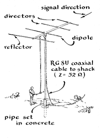 "The counter is a standard telephone job of the rachet type that is available on the surplus market. It is energized through the relay of the control circuit and reads to 9999. A loudspeaker is bridged across the output of the receiver so that the observer can monitor meteors by ear. "The system is not free of error. Lightning strokes, even at appreciable distances, are counted along with meteors The difference can be spotted by ear. Meteors cause a beat note; lightning makes a short, crackling hiss. The level of the squelch setting has an important effect on the count, and it tends to drift. As an aid in maintaining the optimum adjustment we inserted a milliammeter in the circuit. The operation of light switches, plugging or unplugging appliances into the power line, and so on are also counted. When the sporadic E layer of the ionosphere appears, the relay pulls down, putting us out of business. In short, any noise greater than the thresh old at which the squelch circuit is set to operate will register as a count or, if it lasts long enough, mask a count. "A number of alternative methods are available for reducing the error, if one is willing to dig into his wallet. For example, Simpson has suggested a system based on two receivers. The outputs of the two units would be connected so that the signal voltages would be 180 degrees out of phase and would buck one another. One receiver would be locked to the frequency of the transmitter by a quartz-crystal oscillator. The other would be tuned to a slightly different frequency. Both receivers would pick up equal amounts of noise. The resulting noise signals would oppose each other in the control circuit and disappear. In contrast, the desired signal would appear at the output of only one receiver (the one tuned to the transmitted frequency)-and hence would pass through the control circuit unopposed. A pair of BC 454 surplus receivers should work nicely in such an application. Only one would require modification for crystal control; the other would function solely as a noise detector. "We found that many meteors, particular]y those of long duration, produced a warbling note. At first each fluctuation was counted as an individual trail. This was cured by the delay circuit, which holds the relay closed during momentary lulls and prevents overcounting. Too much delay can be introduced. We compromised on a delay of three seconds. If two or more meteors fall within this interval, our equipment counts them as one. "When the system first went into operation we asked: 'Are we really counting meteors?' We got the answer by watching near the horizon in the direction of Cedar Rapids. Within a minute or so a faint streak of light appeared in the sky. The counter clicked and the speaker emitted a loud beep. The system worked! In general we observed that any meteor which can be seen makes an abnormally loud beep. We estimate that the system is capable of counting meteors down to the ninth magnitude. We have not explored the angular range over which we can get radio-visual coincidences, but one night we observed a coincidence at an altitude of 45 degrees. Incidentally, visual meteors more than 30 degrees off the axis of the Yagi are not counted. None are heard if the antenna is turned at right angles to the direction of the transmitting station. "The system operates over an area considerably greater than an observer can cover visually. Visual observations are limited to a cone some 30 degrees in diameter. The beam of our system covers about 40 degrees. When the radio cone is projected to the area containing the trails, it is obvious that far more sky is under surveillance than a visual observer beneath the area could command. The counting rate of the system is accordingly higher, even for meteors of the first magnitude, than would be reported by a visual observer. If the squelch circuit is turned off, the normal count rises to as much as 200 per hour, and can be heard by listening for trails under noise With the squelch fully on, only brighter meteors are counted or heard; they run from 25 to 500 per day. "The system can also be used for detecting auroras. When the northern lights are active, even if not visible from Manhattan, we can turn the Yagi north and count meteors Signals directed to the north by the transmitter apparently bounce off meteor trails and the aurora reflects the signals back to us. We accordingly monitor auroras by pointing the Yagi to the north and keeping it there as long as the counter operates. "The apparatus has now been in intermittent operation for about 10 months, with gaps in the records representing thunderstorms and time out for adjustments, modifications and repairs During the early passes of Sputnik I and Sputnik II we shut the system down so that we could borrow the Yagi for satellite tracking. The station is now fully equipped for satellite work, thus removing this handicap to the meteor program.