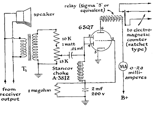 "We pick up reflected signals by a directional antenna of the Yagi type, about the size and same design as a conventional television antenna. The antenna is made of aluminum tubing, one tube being cut in the middle for the receiving dipole, a slightly longer one backing the dipole as the reflector, and two progressively shorter ones mounted in front as directors. The geometry of the assembly is adjusted to the frequency of the transmitter for maximum response. The Yagi is mounted on a steel support for rotation in both azimuth and elevation. The support consists of a pair of telescoping steel pipes, one of which is sunk in concrete. The array is turned by hand. The antenna stands about 10 feet above the ground. Normally we point it toward the horizon, but it can be elevated to any angle desired. A 50-ohm coaxial cable carries the signal into the observatory. "The incoming signal is fed to a shortwave converter tuned to 49.8 megacycles and locked on frequency by a quartz-crystal oscillator. We normally detect a signal on this frequency only when the signal is reflected by a meteor trail. Trying to tune a receiver by occasional signal bursts proved too much for our patience, so we decided that crystal control is a must. Parts for the converter cost $12.50. The receiver is an Army surplus job modified considerably by Simpson. It is also crystal-controlled, and it is fed by the converter at seven megacycles. The receiver features a so-called 'squelch' circuit which in principle resembles the conventional automatic volume-control. Instead of maintaining the output at a uniform level, the squelch circuit cuts the sound completely in the absence of a signal and turns the set on fully when signals appear which are higher than the average background noise. A control is provided for adjusting the squelch to any desired signal level. Hence the output of the receiver is dead until a signal appears. Finally the receiver is equipped with a variable oscillator, the output of which can be mixed with the signal. The pitch of the resulting beat note can thus be adjusted as desired. "Audio output from the receiver is fed to a control circuit which in turn actuates a sensitive relay. The control circuit is built around a 6SQ7 tube, as shown in the accompanying illustration [next page]. The arrangement functions both as a detector for converting the audio signal to direct current and as an amplifier for energizing the relay. A delay element is built into the control circuit which discriminates against groups of signal pulses which persist for less than three seconds. Such groups register a single count. The delay arrangement consists of a one-megohm resistor bridged by a two-microfarad capacitor connected between the Stancor choke and ground. If control of the response time is desired, the fixed resistor may be replaced by a rheostat. The relay is of the type used for controlling model airplanes by radio. They are sold by most hobby shops. The transformer [T1 in the illustration] is a conventional output-transformer hooked up backward.