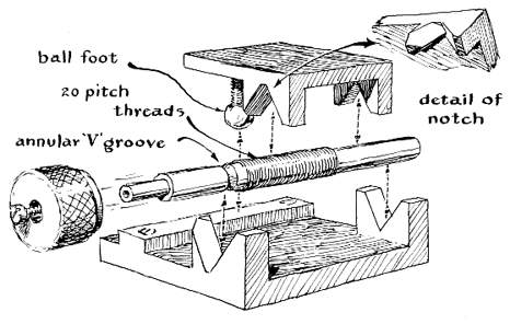 "The device resembles the compound rest of a lathe but is based on the principle of kinematical design described by John Strong in his Procedures in Experimental Physics. This principle states that a body must have at least six minus n points in contact with a second body if it is to have only n degrees of freedom. The screw for advancing the carriage in the direction of the mirror has been accordingly provided with five points of contact with respect to its reference body, the base. This is accomplished by beveling one arm of one of the two V-notches in which the screw rides. The bevel engages the annular V-groove of the screw shaft and accounts for two contacts. The unbeveled arm of the same V-notch makes the third contact with the screw. The flat arms of the remaining V-notch provide the remaining two for a total of five contacts. Thus the screw has one degree of freedom, that of rotation. In contrast, the carriage which rides on the screw is provided with six points of contact with respect to its reference body (the screw and the base): five with the screw and one by the ball in contact with the base proper. Thus the position of the carriage is uniquely determined by each setting of the screw. The design of the transverse carriage conforms to the same principle. "The only machine work involved in making the unit is the removal of threads from each end of the pre-threaded screw stock (for contact with the V-notch bearings ), and the cutting of the annular V-groove in the shaft. All other work can be accomplished with a hacksaw, file and drill. The dials and knurled knobs are from surplus gear. "The light source is a conventional incandescent bulb of the type used in sound heads of 16-millimeter movie projectors. The beam is deflected at a 90degree angle by a microscope coverglass. This is not the best possible arrangement because the two surfaces of the glass reflect a double image of the pinhole. I plan to overcome this by replacing the cover-glass with a beamsplitter of the prism type. A piece of ground glass is mounted between the lamp and pinhole to prevent a magnified image of the lamp filament from appearing at the focus."