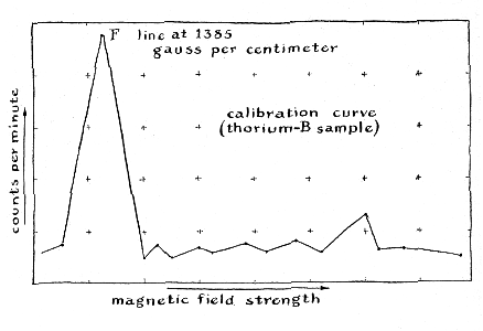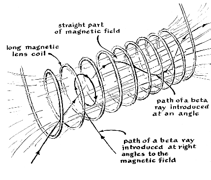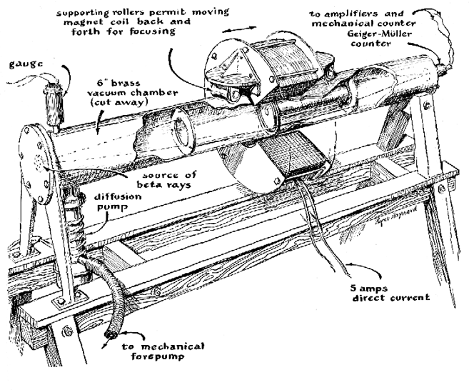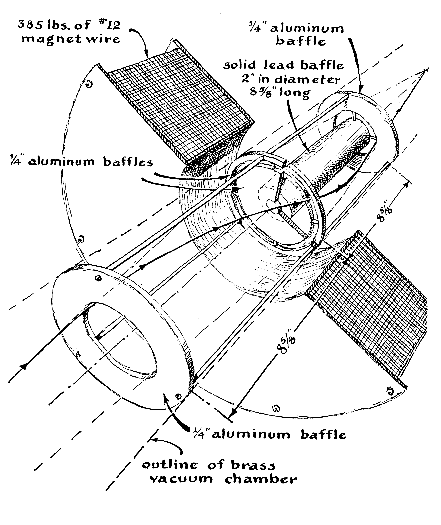 "To provide a clear flight path for the beta particles, the radioactive substance under measurement is enclosed in an evacuated chamber. Some gas molecules remain to bounce around at random inside the chamber, however, because a perfect vacuum cannot be produced. These collide with and divert occasional particles. Some high-energy beta rays also dislodge electrons from molecules of gas, and even from the walls of the vacuum chamber. As a consequence some particles which should be counted do not reach the focus, and others which should not are deflected into the counter. The Geiger tube responds to gamma rays; these must also be excluded from the count. Error from these sources is reduced by equipping the chamber with a system of baffles [see illustration below]. Depending upon the strength of the magnetic field, rays ejected from the source above a certain critical angle strike a ring baffle at the source end of the vacuum chamber. Those below this angle pass through the center opening and proceed to a baffle with a ring-shaped opening, located in the middle of the chamber. Here rays above a certain critical energy level collide with the center stop. Those of lower energy pass through the ring-shaped opening. They proceed through a similar opening in another baffle and enter the counter. A cylinder of lead located on the axis between the latter two baffles shields the counter from gamma rays, which, because they are not deflected by a magnetic field, would travel in a straight line from the radioactive source. "We began to build the instrument in the spring of 1955 by machining the vacuum chamber. This work was done in the University of Washington physics shop. The chamber consisted of a heavy brass tube with an inner diameter of six inches. An outside flange was welded to the source end of the tube and an inside flange to the counter end. These were grooved to take rubber rings and provided with a set of end-plates. During final assembly the rubber rings were coated with silicone grease just before the end-plates were bolted in place. The center of the plate at the counter end was provided with a window of aluminum foil a thousandth of an inch thick. The foil was attached by a special vacuum-sealing compound. Work proceeded simultaneously on the electrical circuits, which included the counter and controls as well as a regulated power supply for the magnet. Some of the electrical parts were gifts from local schools and industrial organizations, but most had to be purchased. By the summer of 1955 we had run out of money. "This meant more fund-raising. Eventually we obtained oil-diffusion pumps from two large organizations. One pump was connected directly to the vacuum chamber at the source end [see Figure 1]. A Welch single-stage mechanical pump brought the vacuum down to five hundredths of a millimeter of mercury. The oil-diffusion equipment went into operation at this point, and reduced the pressure to about 10 microns of mercury. "We employed three gauges for measuring air pressure in the system. A conventional high-pressure gauge calibrated from 0 to 760 millimeters of mercury was connected between the mechanical and diffusion pumps. Two low-pressure gauges were connected directly to the vacuum chamber. One, a National Research Corporation thermocouple gauge, could measure down to one micron. The other, a VG-1A ionization manometer made by the Consolidated Electrodynamics Corporation, extended the reading to a hundredth of a micron. "The inner walls of the chamber were sanded and cleaned frequently with acetone to remove substances which release gas after the pumps are started. Under ideal conditions we could reduce the pressure to about one micron. "The magnetic field was provided by a short coil placed symmetrically around the axis of the vacuum chamber. Wire for the magnet was contributed by A. S. Sheldon, president of the Kennecott Wire and Cable Company. Fortunately it arrived late in 1955, just as we had run out of money again. By this time the instrument was complete except for the magnet and the final assembly of the vacuum system, so we set to work on the coil immediately. It was a job we did not anticipate with relish, because the coil required some 380 pounds of wire. For a time we thought we would have to wind it by hand. Through the cooperation of our principal, however, we were given access to a lathe at a local trade school. Even so the job required 120 man-hours to complete. Each layer of wire had to be placed neatly atop the one beneath it so that the coil would not spread out at the top. Any spreading would distort the magnetic field and decrease the efficiency of the instrument. In all we wound some 18,500 feet of No. 12 magnet wire on a form which consisted of an aluminum tube six inches long and eight inches in diameter. The tube was made into a spool by welding circular plates to its ends. There were 70 layers, each of 78 turns-making a total of 5,460 turns. The coil could take a continuous current of about five amperes without overheating. It generated a field of more than 1,000 gauss at the center of the chamber. This enabled us to focus beta particles with energies of more than two million electron volts. "The coil functions as a lens. Hence we took extreme care to make sure that it was centered accurately between the source and the focal point and that the axis of the magnetic field coincided precisely with that of the vacuum chamber. The mounting which determined the position of the coil consisted of two concave rollers which rode on the upper surface of the vacuum chamber. The rollers were supported by bearings held in position by a system of cams. The horizontal position of the coil with respect to the source and the focus could be altered merely by pushing the coil along the vacuum chamber. Vertical and lateral adjustments were easily made by changing the settings of the cams. "The momentum of the focused particles varies in proportion to the current pass