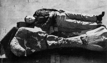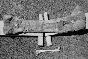 "Recently two amateur uranium prospectors found the largest leg bone-the left humerus of a Brachiosaurus-ever reported. Mrs. Eddie Jones of Delta, Col., and her husband were examining the Morrison formation, a deposit which has become famous for its fossils of large dinosaurs. Suddenly her Geiger counter began to click rapidly, although all she could see underfoot was the bluish shale of the Morrison. When the Joneses dug down a few inches they found a slightly fractured but complete fossil bone seven feet one inch long and 26 inches across at the broadest end [see Figure 1]. As is often the case, the organic material of the fossilizing bone had concentrated-uranium minerals that had moved in dilute solutions through the almost impervious shale. A number of uranium minerals readily replace carbonaceous material, such as old driftwood or bone. It is remarkable how much 'hotter' a fossil bone can be than the surrounding rock. "Unfortunately the Joneses did not realize that their bone was destined to set a new record for size and would ultimately attract proportionate scientific interest. Furthermore, they were afraid that rival prospectors, then busy staking claims in the area, might find and take it. So they drove their jeep up to the find and carted away, like so much ore, over five hundred pounds of the biggest pieces, almost breaking their springs in the process Back home in Delta, some 14 miles away, they roughly aligned the various chunks on the front porch for their neighbors to see. "One night several weeks later I chanced to be passing through Delta on a geological trip and heard about the find. When I visited the Jones home in the evening, I actually tripped over the pieces of a specimen such as I had dreamed about since my first visit as a boy to the great dinosaur halls of the American Museum of Natural History. "So it came about that one Sunday I put the Joneses' Brachiosaurus humerus together for them. Later, while on a trip to the East, I told paleontologists at both the American Museum of Natural History and the Smithsonian Institution about this bone, one far larger than any they possessed. When I described its size by gesturing toward the ceiling, however, I received only skeptical smiles. Finally I submitted a photograph of the bone, myself and a yardstick. That did the trick. "Both the Smithsonian and the American Museum soon asked the Joneses for their bone, but the Smithsonian asked first. This spring we had the satisfaction of watching Peter Vaughn of the Smithsonian and two assistants skillfully cover each fragment with wet paper and then wrap it with a layer of burlap soaked in plaster of Paris. The next day the paleontologists packed the hardened packages in wooden crates filled with shavings and shipped them off to Washington. Before long the Joneses' Brachiosaurus humerus will be displayed against a column in the Smithsonian to help visitors picture one of the largest animals ever to walk the earth. "What is the scientific significance of this huge bone? According to Edwin H. Colbert of the American Museum, the largest dinosaur bone previously found is the Brachiosaurus humerus excavated in Colorado by the Chicago Natural History Museum some 50 years ago. It is a little over six feet, eight inches long. This humerus once supported a Brachiosaurus which weighed about 100,000 pounds. The Joneses' seven-foot one inch humerus must have belonged to an animal that weighed some 120,000 pounds! The head of the animal, judging by the height of a reconstructed Brachiosaurus skeleton in the Berlin Museum, must have towered 44 feet above the ground. This must surely approach the engineering limits for a land animal.