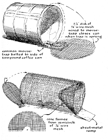 "Snakes are caught where you find them. A slow drive down a deserted road at night will frequently turn up an amazing number of snakes, particularly in the Southwest. Turning over stones and rotted logs is also productive, but in rattler country this should not be done with bare hands; use your snake putter or a stick. Most of my snake-catching is done by the putter-and-net technique. "Traps are not satisfactory for capturing snakes, but they are quite successful with lizards. Two kinds of trap are illustrated here. Spoiled meat inside such traps will attract those lizard species that have a well-developed sense of smell. A simple box trap is preferable for desert regions where shade is scarce, because lizards seek the shade when the sun becomes too hot for their comfort. The box may be two feet square and six inches deep. It is closed at the top with a wooden door and at the bottom with a wire screen. Two or three two-inch holes are drilled in one side about half an inch from the bottom. The trap is placed with the holes on the shady side, and jiggled down into the sand until the bottom of the holes are flush with the surface. The box is then covered with sand (except, of course, for the side with the holes). This keeps the temperature inside the box from rising too high in the hot sun. Lizards approaching from the shady side will find the holes and enter the box. Once inside, they will stay for several hours during the heat of the day. The specimens should be harvested two or three times before the heat subsides. "Netting lizards is usually unsatisfactory because they are far quicker than the netter. The lizard is much less likely to scamper off if it is approached with a noose at the end of a trout-fishing rod. The noose can then be maneuvered over the lizard's head and pulled tight simply by raising the rod. The noose should be made of silk thread rather than nylon, because nylon tends to curl. "Turtles that are accustomed to sunning themselves on half-submerged logs can be trapped by assembling four logs in a rectangle and suspending a net in the water beneath it. The turtles come out of the water from the outside of the rectangle, but they may depart to the inside, particularly if the turtle-trapper appears suddenly from the right direction. They can be kept from climbing out of the trap by studding the inside of the enclosure with nails that point downward at an angle. Turtle-collecting should be done with the knowledge that a number of species are protected by law. The desert tortoise, for example, is protected throughout its range, and the penalty for possessing one can be as much as $500. Eastern turtles that are protected include the box turtle and the wood turtle.