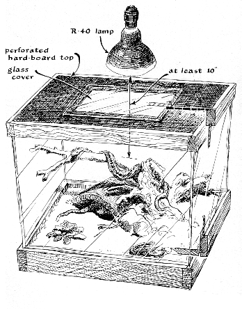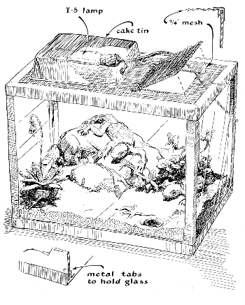 "All reptile specimens are best transported in muslin bags 18 inches wide and a yard long. The bags should have double seams so that the specimens will not become entangled in loose threads. When poisonous snakes are transported, an external tab should be attached to the bottom of the bag so that one can empty the bag without exposing oneself to a bite. "Once you get the captive home, you must think of where to put it. A good container for small reptiles that cannot climb is an aquarium. Of course a wooden box will do as well, though it is desirable to fit the box with a glass front so that you can easily observe what is going on inside. With nonaquatic reptiles it is necessary to cover the box with a snug (but not airtight) cover. Snakes especially have a rare talent for finding a small opening. I use several different kinds of cover: wire screen, perforated masonite and occasionally glass, raised slightly from the top of the container to provide adequate ventilation. The design of the cover is governed largely by the animal inside. Wire screen is generally unsatisfactory for snakes. They have a tendency to rub their noses on the screen and injure themselves. For some of the stronger species of snake a sturdy top is needed, and masonite fills the bill. A glass cover is used when it is desirable to keep the temperature and the humidity high. "Most discussions of reptile-keeping emphasize the importance of avoiding decorative effects in the cages, pointing out that sanitation is a problem and that the humidity resulting from the presence of plants is detrimental. I do not agree with this. Animal cages in the home should be attractive. Moreover, the animals themselves appear to feel more at home in cages that roughly approximate their natural habitat. One can divide cage climate into broad categories-for example, desert, temperate-zone region or bog-and select plants and other surroundings that are compatible. Properly managed, a reptile cage can be as decorative as the handsomest aquarium. One warning: reptiles to be placed in a decorated cage should be carefully inspected for mites. Once introduced into such a cage, mites hide themselves in crevices and are almost impossible to eliminate. "The sanitation problem is most easily met by placing a deep layer (one to two inches) of aquarium gravel in the bottom of the cage. It is a simple matter to pick up excreta and contaminated gravel with a scoop and to replace the gravel from time to time. Many terrestrial reptiles are fond of burrowing on occasion, and aquarium gravel is a good medium in this regard because it does not pack or cake.