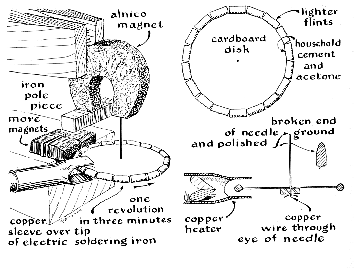R. Stuart Mackay of the University of California calls our attention to an interesting property of the "flints" used in cigarette lighters. At room temperature they are strongly attracted to a magnet, but when they are heated to 125 degrees centigrade they abruptly become nonmagnetic. In effect, they exhibit the property of bistability with respect to temperature and magnetism. Hence they may be used as the active element in novel heat engines. For example, a quantity of flints (the active material is the metal cerium ) could be attached to the bottom of a pendulum and energized by focusing a beam of infrared radiation on them at the point where they pass through the bottom of the swing. A strong magnet would also be located at this point, almost close enough to touch the metal. Once started, the pendulum would continue to swing as long as the infrared was supplied. Because the flints would be heated at the bottom of the swing, they would be strongly attracted to the magnet during the downswing and less strongly attracted to it during the upswing. Accordingly a net transfer of energy from the infrared beam to the pendulum bob would occur. Mackay suggests that the effect can also be applied to a device for converting heat into rotary motion by fixing a number of flints to the rim of a disk free to turn on an axle. A source of heat and a magnet would be located at adjacent points on one side of the disk. A motor of this type has been constructed by Roger Hayward, who illustrates this department. According to Hayward, the motor does not run very fast, and its output is in the "flea-power" class. "The power of the engine was so minute," writes Hayward, "that I had to fit it with a magnetic bearing to make it run at all! As an interesting demonstration, however, it is well worth the time spent on its construction. I chanced to have 18 lighter flints on hand; this determined the size of the engine that is shown full scale in my drawing [above]. The axle was an ordinary sewing needle broken near the middle. The sharp end was discarded and the broken end of the remaining part rounded and polished. The eye was then threaded with a quarter-inch of fine copper wire as a stop for a washer made of lucite which supported the disk, as shown in the lower right detail of the drawing. The rounded end of the needle is attracted to one pole of a small alnico magnet clamped in position as shown. The flints are stuck to the edge of the rotor by quick-drying cement which has been thinned with acetone. "Energy to drive the engine is taken from an electric soldering-iron fitted with a short length of copper tubing split at the outer end. The magnet which exerts force on the flints actually consisted in my case of a pair of small alnico bars salvaged from a discarded magnetic ash tray. They were assembled with the north poles and south poles pointing the same way, and were held together with a rubber band. This assembly was placed close enough to the flints to pull the disk about five degrees out of plumb. The split portion of the hot copper tube was placed over the flints at a point as close as possible to the driving magnet. When heat was applied, the rotor turned somewhat unevenly at about a third of a revolution per minute."
