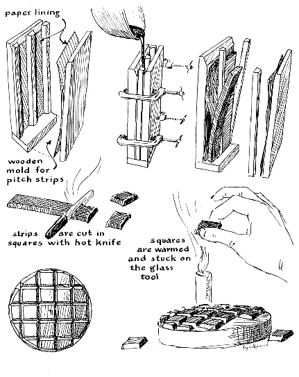 Fresh Carborundum cuts effectively, and the grinding is accompanied by a characteristic gritty sound. Initially the work has a smooth, well-lubricated feel. After a few minutes the gritty sound tends to soften and the work has a gummy feel. Stop at this point, add another teaspoon of water and resume grinding until the work again feels gummy. Both the mirror and tool are removed from the bench and washed free of "mud," the mixture of pulverized glass and powdered abrasive that results from grinding. This marks the end of the first "wet." Fresh Carborundum is now applied, and the procedure is continued for three additional wets. The stroke is then shortened to a third of the diameter of the mirror (two inches in the case of a six-inch mirror) for two more wets. The mirror should now show a uniformly ground surface to the edge of the disk in every direction. If not, continue grinding until this is achieved. The ground surface now has the form of a shallow curve and must be tested for focal length. This is easily accomplished on a sunny day. The test equipment consists of a square of light-colored cardboard about a foot across which serves as a screen on which the image of the sun is projected, and a supply of water to wet the roughly ground surface of the mirror and thus improve its effectiveness as a reflector. Stand the cardboard on edge at a height of about six feet so that one side faces the sun squarely; then take a position on the shady side about 10 feet from the screen. Dip the mirror in the water and, with the ground surface facing the sun, reflect sunlight onto the screen. The image will appear as a fuzzy disk of light, doubtless somewhat smaller than the diameter of the mirror. The size of the image will change as the mirror is moved toward or away from the screen. Find the distance at which it is minimum. This is the approximate focal length of the mirror. At this stage of grinding, the focal length will doubtless be of the order of 15 feet. The object is to shorten it to six feet by additional grinding. Wash the tool, apply fresh abrasive, grind for five minutes and repeat the test. It is advisable to make a chart on which the focal length is recorded after each spell of grinding. The chart aids in judging progress toward the goal of six feet. When the desired focal length is attained, thoroughly scrub the mirror, tool, bench, utensils and all other objects likely to be contaminated with No. S0 abrasive. Grinding is then continued with successively finer grades of abrasive. The same stroke is used: two inches in length and center-over-center. Usually the second grade is No. 180, which has the texture of finely powdered sand. The grinding technique is precisely the same for all subsequent grades of abrasive; each stage of grinding is continued until all pits made in the glass by the preceding grade have been removed. Usually six wets with each grade is adequate. On the average each wet will require about 15 minutes of grinding. Examine the ground surface by means of a magnifying glass after the sixth wet. If any pits larger than average are found, continue grinding for another wet or two and examine again. Persist until all pits larger than average disappear. There is one exception to this procedure. Sometimes a stray grain of No. 80 or one of the intermediate grades will find its way into work that has reached the terminal stages of fine grinding. A scratch or groove will appear that is so deep that it cannot be removed by a reasonable amount of fine grinding. The only solution is to return to the offending grade and repeat all the intermediate work. Gloves are notorious grit-catchers. Never wear them when grinding. Try to prevent clothing from coming into contact with loose grit. Abrasives supplied with representative kits include Nos. 80, 180, 220, 280, 400, 600, FFF and rouge. The beginner is urged to purchase an extra mirror-blank. The object is to make two mirrors simultaneously, select one for immediate use and reserve the second for subsequent refinement. Those following this suggestion should grind the mirrors alternately. Complete a wet of a given grade on the first mirror and proceed with the same wet on the second. After all grinding is completed, the mirrors are polished independently. The operations of grinding and polishing glass are similar in that both require the use of a material which is harder than glass. In grinding, the abrasive material is used between a pair of hard surfaces, either two pieces of glass or glass and cast iron. In rolling between the surfaces under pressure the hard particles erode the glass by causing tiny conchoidal fractures in its surface. Glass can be polished with the same hard particles merely by replacing the hard tool with an appropriately soft and yielding one. The theory of the polishing action is not well understood. It is clear, however, that the abrasive particles do not roll. Held firmly by a yielding medium, their protruding edges may act like the blade of a plane. Most amateurs use a polishing tool, or "lap," of pine pitch divided into a pattern of facets and charged with rouge. To make the facets, pitch is first cast into strips about an inch wide, a quarter of an inch thick and eight or 10 inches long. An adequate mold of wood (lined with moist paper to prevent the strips of pitch from sticking) is depicted in Figure 3. Melt the pitch over a hotplate, not over a direct flame. Do not overheat the pitch; it burns easily. The fumes (largely vaporized turpentine) are highly combustible, so prevent direct flame from reaching the open part of the container. The strips of cool pitch are cut into square facets by means of a hot knife and stuck to the ground surface of the tool in a checkerboard pattern as shown Begin by locating one facet somewhat off-center in the middle of the tool, and work outward. Adhesion is improved by first warming the tool, smearing it with a film of turpentine and warming the face of each square of pi