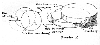 The beginner is urged to start with a six-inch mirror. Those of smaller size do not perform well unless they are skillfully made, and the difficulty of handling larger ones increases disproportionately. Kits for six-inch mirrors retail for about $10. They include two thick glass "blanks," one for the objective mirror and one (called the tool) on which the mirror is ground. The kits also supply a small rectangle of flat plate-glass that serves as the diagonal, a series of abrasive powders ranging from coarse to fine, a supply of optical rouge for polishing and a quantity of pine pitch. As Russell Porter explained 34 years ago, "In the reflecting telescope, the mirror's the thing. No matter how elaborate and accurate the rest of the instrument, if it has a poor mirror, it is hopeless." Fortunately it is all but impossible to make a really poor mirror if one follows a few simple directions with reasonable care. The idea is to grind one face of the six-inch mirror-blank to a shallow curve about a 16th of an inch deep, polish it to a concave spherical surface and then, by additional polishing, deepen it increasingly toward the center so that the spherical curve becomes a paraboloid. The spherical curve is formed by placing the mirror blank on the tool, with wet abrasive between the two, and simply grinding the mirror over the tool in straight back-and-forth strokes. Nature comes to the aid of the mirror-maker in achieving the desired sphere, because glass grinds fastest at the points of greatest pressure between the two disks. During a portion of each stroke the mirror overhangs the tool; maximum pressure develops in the central portion of the mirror, where it is supported by the edge of the tool. Hence the center of the mirror and edge of the tool grind fastest, the mirror becoming concave and the tool convex. As grinding proceeds, the worker periodically turns the tool slightly in one direction and the mirror in the other. In consequence the concavity assumes the form of a perfect sphere because only mating spherical curves remain everywhere in contact when moved over each other in every possible direction. Any departure from a true sphere is quickly and automatically ground away because abnormal pressure develops at the high point and accelerates local abrasion. The grinding can be performed in any convenient location that is free of dust and close to a supply of water. The operation tends to become somewhat messy, so a reasonably clean basement or garage is preferable to a kitchen or other household room. A support for the tool is made first. This may consist of a disk of wood roughly half an inch thick fastened to the center of a square of the same material about a foot on a side. The diameter of the wooden disk should be about half an inch smaller than that of the tool. All surfaces of this fixture, except the exposed face of the wooden disk, should receive two coats of shellac. The glass tool is then cemented symmetrically to the unfinished face of the wooden disk by means of pitch. Melt a small quantity of pitch in any handy vessel. Warm the tool for five minutes in reasonably hot water, then dry it and rub one face lightly with a tuft of cotton saturated with turpentine. Now pour a tablespoon of melted pitch on the unfinished face of the wooden disk and press the tool against it so that pitch squeezes out all around the joint. After the tool and supporting fixture cool, they are a unit that can be removed from the bench conveniently for cleaning, which is frequently needed. Some workers prefer to attach the wooden disk to a large circular base. The base is then secured to the bench between three wooden cleats spaced 120 degrees apart. This arrangement permits the base to be rotated conveniently. The tool assembly is now fastened on the corner of a sturdy bench or other working support, and a teaspoon of the coarsest abrasive is sprinkled evenly over the surface of the glass. A small salt-shaker makes a convenient dispenser for abrasives. The starting abrasive is usually No. 80 Carborundum, the grains of which are about the size of those of granulated sugar. A teaspoon of water is added to the abrasive at the center of the tool and the mirror lowered gently on the tool. The mirror is grasped at the edges with both hands; pressure is applied by the palms. It is pushed away from the worker by the base of the thumbs and pulled forward by the fingertips. The length of the grinding strokes should be half the diameter of the mirror. In the case of a six-inch mirror the strokes are three inches long-a maximum excursion of an inch and a half each side of the center. The motion should be smooth and straight, center over center, as depicted in the drawing above. Simultaneously a slight turn is imparted to the mirror during each stroke to complete a full revolution in about 30 strokes. The tool should also be turned slightly in the opposite direction every 10 or 12 strokes, or, if he prefers, the worker may shift his position around the tool. Learn to judge the length of the stroke. Do not limit it by means of a mechanical stop. Beginners will tend to overshoot and undershoot the prescribed distance somewhat, but these errors average out.