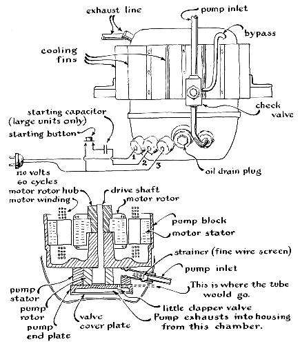 "Of these," he writes, "the Norge Rollator belt-driven unit rates best for vacuum produced. Frigidaire rates best for availability and second best for two-stage service below .020 millimeter of mercury. (Atmospheric pressure at sea level supports a column of mercury 760 millimeters high in a tube closed at the top.) The Coldspot, though unsuitable for pressures below .5 millimeter, is superior to the Frigidaire as a single unit. "The modifications are not difficult. Those required to convert the Frigidaire 'Meter-Miser,' the unit that has been standard on this company's domestic refrigerators since 1936, are illustrative. The smaller refrigerators contain split-phase motors rated at less than 1/7 horsepower. The Imperial or Cold Wall series and all refrigerators larger than 135 cubic feet contain capacitor motors. The purchaser is advised to procure the capacitor as well as the compressor. The motor is not self-starting; it is therefore advisable to procure the starting relay as well. If this is not available, one may improvise a starter from a push-button switch. The motor is started by applying power to terminals 1 and 3 in the accompanying drawing [Figure 2] and short-circuiting terminals 2 and 3 (by means of the relay or push button) for a period of about four seconds. "The pump is modified in three respects. The bypass line which runs between the housing and the check valve must be cut off and the ends sealed. The pump will then produce a vacuum of one millimeter if the check valve is open and the strainer is not wet with oil. The check valve opens automatically when the pressure in the system is above three millimeters. The pressure will not drop below 10 millimeters if the strainer is wet with oil. Oil can be removed from the strainer and the check valve opened by permitting air to flow through the pump for a few minutes prior to connecting the unit to the vacuum system. The screen may be removed, but great care must be exercised thereafter to prevent dirt or foreign material from entering the pump. To make this modification, cut the intake line about an inch away from the housing. Use a tube cutter, not a hacksaw, or particles from the saw will almost certainly find their way into the pump and cause it to stall. Bend the cut tube out of the way, then dig the strainer from the opening by means of a small hook made from a nail or steel wire. Inspect the opening carefully and remove all stray wires of the screen by means of tweezers. Cap the opening with a short length of rubber tubing and close the end with a pinch clamp. "The pump operates best when tilted at an angle of 10 or 15 degrees, as shown in the drawing of the system [Figure 3]. The line to the oil trap should be pitched upward away from the pump to prevent the formation of oil pockets that would impede the free flow of air. The trap can be made from a quart milk-bottle. "In addition to the compressor and oil trap, the system includes a dirt trap made from a half-gallon glass jug, and a pair of vacuum reservoirs, each a gallon glass jug. As a safety measure all the jugs are housed in wooden boxes to catch fragments in the event that atmospheric pressure shatters the glass. The various units of the system are interconnected by 3/8-inch copper tubing, perforated rubber stoppers and couplings of rubber hose. Five of the hose couplings are equipped with pinch clamps and act as valves as shown. "To operate the system, first connect the vessel to be evacuated and close the clamp between the exhaust port [knife cut in rubber tube in illustration in Figure 2] and the rest of the system. Then open all the other clamps, and start the pump. This will reduce the pressure of the entire system, including that in the vacuum reservoirs, to about one millimeter. Now the clamp between the two reservoirs is closed, and operation is continued for about five minutes with the clamp between the pump exhaust and the reservoirs open. This has the effect of connecting the input of a second compressor to the exhaust port of the first, one vacuum reservoir serving as the added compressor. The clamp between this reservoir and the exhaust port of the pump, and the clamp between the reservoirs and the line leading to the oil trap, are now closed. The clamp between the reservoirs and the exhaust port of the pump is opened. This permits the system to exhaust into the second reservoir, now the one of lower pressure. With continued operation the pressure will then fall to the limit of the system's capacity. The compressor can operate for a whole day without increasing the pressure in the reservoir more than one or two millimeters." As a rough check on the vacuum produced one can set up a glow-discharge tube like that previously described in this department [see "The Amateur Scientist"; February, 1958]. When excited by an induction coil capable of giving a quarter-inch spark between two needle points in air, a small glow will be observed at a pressure of five centimeters of mercury. At a pressure of 10 millimeters the whole tube will fill with a pink glow, and at about 2.5 millimeters this glow will break into a series of disk-like striations. Finally, at pressures substantially below .01 millimeter, green fluorescence appears on the inner walls of the glass, and below .001 millimeter the tube goes black. An interesting project requiring a vacuum is the construction of the radiometer depicted in Figure 3. The bracket for supporting the vane assembly can be made of a short metal strip as shown. The point of the needle must rest either on hard, smooth metal or on glass. It is not difficult to make the entire bracket out of two glass stirring-rods of the kind used for mixing drinks. One rod is heated by a small gas torch successively at two points, until it is soft and bent in the form of a square-cornered "C," the opening of the "C" being made just slightly wider than the length of the sewing needle previously selected to serve as the shaft. Facing indentatio