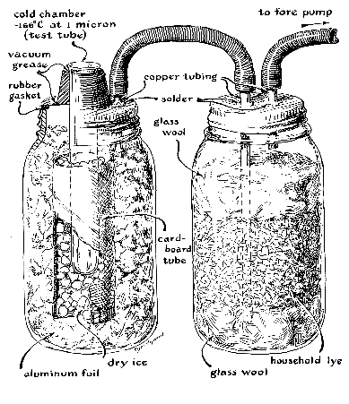 Compressors take a variety of forms: piston pumps, rotary pumps in which a solid cylinder fitted with sliding vanes rotates inside a sealed hollow cylinder mounted eccentrically with respect to the rotor, high-speed drums or disks that turn inside a close-fitting housing and impart a preferred direction to gas molecules impinging on them from random directions, and jet pumps of various types. In no sense do these pumps "suck" gas from the vessel being evacuated. Pumps merely gather those molecules that chance directs their way and move them to an exhaust port, from which they escape into the atmosphere. No matter how long the compressors operate, the probability is low that all the molecules will escape from the vessel. Although a perfect vacuum cannot be achieved, one can assemble a vacuum system capable of reducing atmospheric pressure inside a gallon vessel by a factor of 100 million or more at a cost of less than $30. The uses of such a system in the home laboratory are almost endless. A partial vacuum at the end of a pipe, for example, will produce the same flow of liquid as an equivalent pressure at the other end and will greatly reduce the time required for a fluid to pass through a filter. Or, as another example, the experimenter may wish to avoid the grosser physical or chemical effects of air: its movement, heat conduction, radiation absorption or oxidation. Atmospheric pressure influences the temperature at which many chemical reactions occur. The reduction of iron oxide by carbon, for instance, is normally accomplished in a furnace. But under an adequate vacuum the reaction proceeds at low temperature to yield free iron and carbon monoxide. Another area of interest has to do with vapor pressure. The boiling point of substances is directly related to their vapor pressure and thus to the pressure of the surrounding atmosphere. In consequence the amateur equipped with a vacuum system and a few ounces of dry ice can reduce the temperature of a test chamber almost to the boiling point of liquid air. Finally, to the experimenter interested in electronic and nuclear phenomena the vacuum system is as indispensable as the lathe is to the machinist. A simple but effective system can be had by modifying the compressor unit from a used refrigerator. In most communities operable units can be purchased from appliance dealers at prices ranging from $5 to $10. F. B. Lee, a member of the faculty at the Erie County Technical Institute in Buffalo, N.Y., has investigated a number of makes and reports that three lend themselves to vacuum work: Frigidaire, Norge and Coldspot.