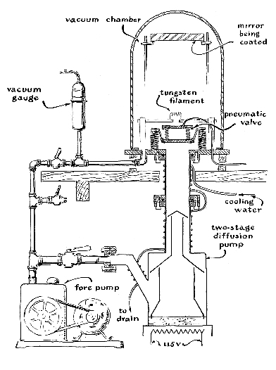 As an introduction to vacuum technology, consider the air at ordinary atmospheric pressure inside a gallon jug on an average summer day. The jug encloses about a quarter of an ounce of gas, the molecules of which, driven by thermal energy, bounce endlessly off one another and the walls of the container like a load of ping-pong balls in a truck jouncing over a corduroy road. On the average the molecules move at about twice the velocity of a bullet from a high-powered rifle, but travel only a few millionths of an inch before experiencing a collision. To clear the myriad molecules from a vessel in preparation for an experiment, one has the choice of three basic techniques, which may be used singly or in combination. First, the gas can be displaced by another substance, which is then withdrawn to leave a vacuum. Second, gas can be mechanically pushed out of a space connected to the vessel, so that molecules in the vessel can escape by their own random motion; the gas pressure is steadily lowered as the pushing is continued. Third, a solid material, usually a thin film of metal, that removes the gas by combining with it can be introduced into the vessel. The first of these techniques was devised by Evangelista Torricelli to demonstrate that there is such a thing as a vacuum. Torricelli's experiment is described in a letter he addressed on June 11, 1644, to Michelangelo Ricci in Rome: "I have made an instrument of glass tubing," he wrote, "sealed at one end and about two cubits [35 inches] long. It was filled with quicksilver, its mouth closed with a finger and then it was inverted in a vessel containing quicksilver. When the finger was removed the tube was seen to empty partly, without anything entering while it emptied. The lower part of the tube remained always full, however, to the height of a cubit, a quarter and a finger extra. To show that the tube was empty above, we then filled the remaining part of the bowl with colored water up to the brim and slowly raised the tube until its mouth was seen to reach the water. The quicksilver suddenly dropped down from the tube and, with a horrible impact, the water shot up to the very top! The result makes it plain that the space above the quicksilver was empty." Torricelli then surmised that air pressing down on the surface of the mercury in the bowl exerted the force that supported the mercury in the tube. In modified form Torricelli's apparatus evacuated the first electric-light bulbs, and it still renders service as the mercury barometer. Incidentally, those who repeat the experiment are cautioned to keep a finger partly over the mouth of the tube as the water displaces the mercury; otherwise the "horrible impact" may shatter the glass. It is also well to keep in mind that mercury evaporates slowly even at room temperature, and that its fumes are toxic. It is possible to produce useful vacuums by displacing air with mercury. But pumps based on Torricelli's principle are tedious to operate. Most modern experimenters therefore employ various combinations of the second and third basic techniques. Unwanted gas is cleared from the vessel by compressors designed to operate at low pressure. Residual gas is then trapped, if desired, by a "getter" (an evaporated film of a metal such as barium) or the gas can be adsorbed on charcoal.