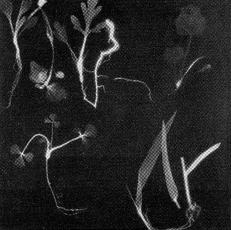 "The relative merits of the autoradiograph and Geiger-counter techniques can be demonstrated by an experiment designed for determining the half-life of a radioisotope. Iodine 131, with a known half-life of 8.08 days, makes a convenient specimen. To determine its half-life, first add 10 milliliters of distilled water to the bottle containing 10 microcuries of the isotope, replace the cap on the bottle and swirl the contents gently for a few minutes. (Incidentally, a one-microcurie-per-milliliter solution is a convenient dilution for many experiments.) Now with a punch of the kind used for perforating notebook paper cut two disks from a sheet of blotting paper and transfer two drops of the solution to each disk. Dry the disks, cement them to cardboard, label them with the name of the isotope, date the card and wrap it with a single sheet of thin plastic. Next, switch the Geiger counter to its most sensitive position and move the card toward the counter tube until the meter shows a deflection of approximately 80 per cent of the full scale. A wooden fixture is now made for holding the card and counter tube at this empirically determined distance. The fixture must be designed so that card and tube can be returned precisely to their respective positions whenever desired. The instrument reading is then recorded, along with the date. "Next the card is placed in contact with a sheet of film and weighted down. A similar card is prepared on the following day, its rate of count is measured and it is placed in contact with the film. This is repeated every day for two weeks. Each film is exposed for 12 hours and then developed. When all films have been developed, the tabulated readings of the Geiger counter are plotted as the ordinate on semilog graph paper against the time in days (in intervals of equal length) on the abscissa. If the intervals of the log scale are numbered from O to 1, a horizontal coordinate drawn from .5 on the ordinate to the graph and a perpendicular dropped from this point of intersection to the abscissa, will show the half-life of the isotope. Compare the slope of the graph with the gradually diminishing intensity of the auto-radiographs. Do not be too disappointed if the half-life as indicated by your initial experiment fails to agree with the known value. You will come closer with practice. "As a variation of the experiment you can put a pair of disks on each card, one pair charged with iodine 131 and the other with phosphorus 32 [see illustration top]. Solving the resulting graph for the half-life of each radioisotope is an intriguing problem. In interpreting the data remember that the beta particles from phosphorus 32 are more likely to reach and trigger the Geiger counter than are the lower-energy particles of iodine 131. The analysis is further complicated by the fact that the disintegration of radioactive iodine is accompanied by the emission of both a beta particle and a gamma ray. The gamma ray travels through a much greater thickness of air before expending its energy than does the beta particle, but only a small percentage of gamma rays trigger a count. "The application of radioisotopes for measuring physical quantities such as thickness can be demonstrated by a simple experiment based on the absorption of beta rays. A source of penetrating beta rays, such as those emitted by phosphorus 32, is placed at that distance from the counter tube which drives the meter to full scale. A rubber sheet of known thickness is then placed between the source and counter tube and the count recorded. Several additional sheets are then added successively to the first, the count being recorded for each added sheet. The known thickness of the sheets is then plotted against the respective rates of count. One or more sheets may then be stretched. The unknown thickness of the stretched rubber is determined by referring the observed reading for the stretched sheets to the graph. Rubber stock for the experiment may be cut from an old inner tube. "Tracers have become powerful tools in biological experiments for probing such matters as the distribution of a given element in the structure of a growing plant. For example, some familiar house plants have leaves that are partly green and partly white; is phosphorus more likely to be deposited in the green portion of the leaf than in the colorless portion? To study this question the roots of a plant with such leaves were placed in 30 milliliters of water containing one microcurie of phosphorus 32. Individual leaves were removed after one, two, three, four and five hours, laid on a sheet of cardboard, wrapped with plastic film, placed in contact with X-ray film in light-proof envelopes and pressed under a book for 10 hours. No radioactivity was apparent on the developed film. When the experiment was repeated and the film was exposed for 24 hours, however, radioactive phosphorus was detected in all the leaves. There was no difference in the amount of phosphorus taken up by the green and by the white portions of the tissue. It should be interesting to try this experiment with isotopes of other elements and to vary the light, temperature and other conditions under which the plants are grown. "Do plants of various species differ in their absorption of the radioactive isotopes sulfur 35 and iodine 131? Plants of six different species were placed in separate solutions of 20 milliliters of water, to each of which one microcurie of sulfur 35 and one of iodine 131 had been added. The accompanying autoradiographs [Figures 2 and 3] show the relative absorption of each of the species after they had been in the solutions for 29 hours. As noted earlier, it is difficult to gain quantitative data from autoradiographs, particularly when two isotopes are combined that emit beta rays of differing energies. The beta particles from sulfur 35 have scarcely enough energy to penetrate the tissues of the plant, but the radiations from iodine 131 are capable of exposing the 