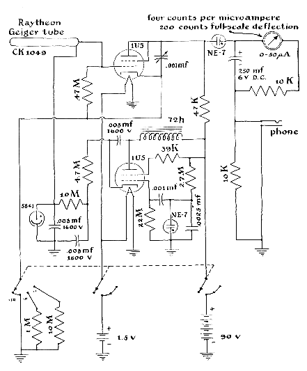 "The pulse may be amplified to actuate a headphone, a meter or a counter. Meanwhile the positive ions formed by the radiation are accelerated toward the cylindrical cathode. If permitted to strike the cathode, these energetic ions dislodge electrons from it and thus initiate a series of avalanches that paralyze the tube. This is prevented by introducing into the tube a 'quenching' vapor: a small quantity of alcohol or a halogen such as bromine. The accelerated ions collide with and give up energy to the molecules of the quenching vapor; they usually acquire an electron during the encounter and thus become passive. In the case of organic quenchers such encounters result in the permanent dissociation of the quenching molecules; on the average a billion molecules of alcohol are dissociated per count. In consequence the useful life of the tube is limited to about 100 million counts. Halogen molecules, on the other hand, are merely raised to an excited state by such collisions and return to their low-energy state within 24 hours. "In theory the life of halogen-quenched tubes is unlimited, but in practice they must be replaced after about 10 billion counts. The electrodes of most Geiger tubes are enclosed by a glass envelope so thin that it can barely withstand the difference in pressure between its gas and that of the atmosphere. Thick glass would block the entry of low-energy particles. For this reason Geiger tubes are among the most fragile items of scientific apparatus. An eggshell is strong in comparison with the tubes used in the most sensitive counters. Handle the tubes accordingly. "A primitive counter can be made by supplying voltage to a Geiger tube through a 10-megohm resistor and connecting a headphone, in series with a .001-microfarad capacitor, across the terminals of the tube. Each triggering particle will be heard in the headphone as a sharp click. Although interesting as a demonstration, an instrument made this way is of little use in experimental work because you are likely to hear so many counts that you cannot record them. The circuit of a self-contained, battery-powered counter of more advanced design is shown in the accompanying diagram [Figure 4]. In this instrument current pulses from the Geiger tube are amplified by the vacuum tube in the upper part of the diagram. Successive pulses from the amplifier are fed into the 250-microfarad capacitor at upper right. The rate at which charge accumulates in the capacitor is determined by the frequency of the current pulses. The capacitor discharges through a microammeter calibrated in counts per minute. The circuit includes provision for a headphone so that the counts can also be monitored by ear. The entire assembly, including the batteries, can be housed in a box three inches wide, four inches high and six inches long. The counter tube should be protected by an appropriate length of rigid plastic tubing, If you have no experience in assembling and wiring electronic components, look up a neighboring radio amateur. One or more will be found in every community, and I have yet to meet one who has not welcomed the opportunity to lend a hand. It is possible to add an accessory to this instrument for registering total count during a specified interval. This provision more than doubles the cost, however, and is not essential for the experiments I shall describe.