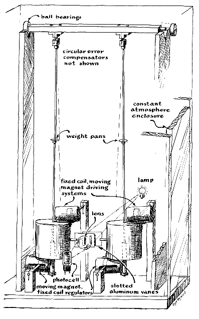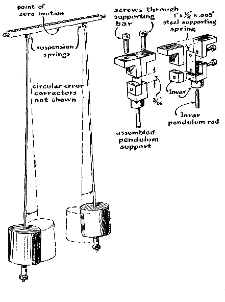 "There is no such thing as an immovable support," writes Jackson. "A pendulum with a 14-pound weight, or bob, swinging through an arc of 1.5 degrees at the rate of one beat per second produces a horizontal force on its support that varies from zero in the center of the swing to nearly a fifth of a pound at each end of the swing. If the circular error has been corrected, or if the pendulum swings through a very small arc, the force varies sinusoidally. There is a similar sinusoidal force in the vertical direction which varies with twice the pendulum frequency, but which is very much smaller in magnitude (about a hundredth as large). Vannevar Bush and I have devoted much effort over a period of several years to gaining a detailed understanding of the effects of such small forces on the rate of a pendulum and devising means of overcoming them. We call the effect 'support reaction.' "Support reaction does not seem to have received much recognition in the past, other than the realization that a solid and massive support is desirable. We have found that the reaction is subject to experimental, quantitative investigation, and we have devised means for overcoming the effects, which turn out to be unexpectedly large. "The experiments were made on a Shortt clock borrowed from the National Bureau of Standards. ( The clock had been superseded by quartz-crystal oscillators. ) The instrument was mounted on a cinder-block wall in the basement of my home, where it was fitted with an attachment that corrects circular error, and its original gravity-electric drive was replaced with a new kind of air drive. At that time it was felt that escapement errors were the chief cause of irregular behavior. Actually the air drive turned out to be difficult to adjust and generally not worth the trouble, but after modification the pendulum held to the time signals on the Bureau of Standards Station WWV within one millisecond for one period of 36 hours. Then, during the next eight-hour period, we observed a departure of several hundredths of a second from the signals of Station WWV. "Everything about the clock seemed to be functioning perfectly during these last eight hours. We noted, however, that it had rained during the night. Subsequent observations showed that changes in humidity affected the rate of the clock, in spite of the fact that it was sealed in an airtight case! It became obvious that the mechanical properties of the cinderblock wall and/or the house foundation must be changing enough to influence the rate by several hundredths of a second a day. "It can be shown mathematically that the horizontal force on the support of a theoretical pendulum swinging through a small angle (or, if the pendulum is corrected for circular error, through a large angle) varies sinusoidally. The force has a maximum value equal to the centrifugal force that would be produced if the mass of the pendulum were rotated uniformly about a vertical axis on a radius equal to half the amplitude of swing, at a rate of one revolution for each complete swing of the pendulum, that is, one revolution in two seconds for a' seconds' pendulum. It can also be shown that the sinusoidally varying vertical force has a maximum value equal to the centrifugal force that would be produced by rotating the mass of the pendulum about a horizontal axis on a radius equal to half its vertical rise during each half swing, at a rate of one revolution per half swing, that is, one revolution per second for a seconds pendulum. "This information enables us to construct a system of revolving weights that at every instant precisely balances and counteracts the dynamic forces exerted by a swinging pendulum on its support. The centrifugal force produced by a given mass revolving at a given radius is proportional to the product of the mass times the radius. So instead of using a rotating weight with a mass equal to that of the pendulum, we can use a weight with a 10th or 100th of this mass, mounted on a lever arm 10 or 100 times longer. The vertical motion of the bob of a seconds pendulum swinging through a total arc of 1.5 degrees is less than .004 inch, but if the bob weighs 10 pounds, we can use a weight of .01 pound rotating on a radius of slightly less than two inches to counteract the vertical force. This is obviously more convenient than trying to rotate a weight of 10 pounds on a radius of .002 inch.