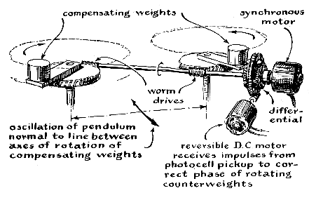 "To prevent motion in a plane at right angles to the plane of swing of the pendulum, two half-size weights on parallel shafts can be rotated in opposite directions to give a sinusoidal thrust in only one plane at right angles to the plane of the two shafts [see illustration]. The weights compensating for vertical motion can be conveniently mounted directly above or below the point of suspension of the pendulum so as to produce their thrust through this point, but the weights that generate horizontal thrust must be mounted so their centers of gravity are at the same level as that of the bob. As they move from side to side they will then not only cancel the horizontal forces but also obviate the torques exerted on the clock support by gravity. "The problem of synchronizing these revolving weights so that they always rotate at exactly the right rate, and exactly 180 degrees out of phase with the pendulum, was a formidable one. It was finally solved with fair accuracy by driving the weights with a synchronous motor operating on ordinary 60-cycle alternating current, the frequency of which seldom varies more than five seconds from the correct time. The motor was coupled with the weight system through a differential gear. The 'cage' of the differential, in turn, was connected to a reversible direct-current motor that received impulses each second from a photoelectric-cell pickup on the pendulum. This signal was fed through a series of relays and cam-operated switches on the revolving shafts, arranged so that the direct-current motor added or subtracted a fraction of a revolution as needed to keep the weights 180 degrees out of phase with the pendulum. "A stroboscopic-flash unit actuated by the weights as they passed their dead-center position illuminated a beat plate on the pendulum for initial adjustment of phase angle. Observation showed that this system remained synchronized and maintained phase angle to within less than a degree. The system is still not quite good enough, however, for a truly accurate clock. "Such a system is capable of canceling all support reaction and movement only when the arc of the pendulum can be held to the value for which the mass of the weights and their lever arm was designed. Considerable difficulty has been experienced in maintaining the arc at constant amplitude. Added to this effect is the error caused by the slight variation in phase angle between the weights and the pendulum. With this arrangement, however, our clock has held the same rate as Station WWV to within a few milliseconds per day, with an accumulated error at the end of a week of only about three milliseconds. "In order to exaggerate the effect of support reaction, the whole clock case, together with its rigidly attached system of revolving weights, was mounted about seven inches out from the wall on four half-inch steel bolts. This provided a cantilever mounting that is sufficiently stiff to support the 100-pound clock, but is more resilient than the usual mounting, in which the clock is bolted directly to the wall. "The horizontal resilience of this mounting, measured by the movement of the pendulum support when a known horizontal force was applied, was about 285 millionths of an inch per pound. The force of the swinging pendulum, weighing .118 pound, thus deflected it less than 60 millionths of an inch. "Three stiff metal struts-two horizontal and one vertical-were also provided to reduce the resilience at will. (They could be anchored to the wall at their outer ends with lag screws.) The rate was adjusted with the struts removed and the compensating weights running. When the weights were stopped, the rate of the pendulum was 6.42 seconds per day slower. With the struts bolted to the wall (which made the mounting almost as stiff as a case mounted rigidly on the wall), there was still a loss of two seconds per day when the weights were not running, caused by movement of the wall and doubtless of the whole house. But with the weights operating, no difference could be detected when the struts were removed, showing that the weights were completely canceling the support movement. "A most astonishing result emerged from these tests. No effect on the pendulum's rate could be traced to vertical support reaction! It makes no difference whether the vertical compensator is operated or not, or even if it is run in phase, instead of 180 degrees out of phase, so as to add its effect to that of the pendulum rather than providing a cancellation. This is true whether the struts are bolted to the wall or not. "It now becomes evident that the simplest way to remove the effect of support reaction on rate is to use a double pendulum with two identical bobs swinging in opposite directions 180 degrees out of phase. The vertical forces developed by the pair on the support add up, but cause no change in rate; the horizontal forces cancel precisely at every instant. Hence, although it is not possible to find a perfectly rigid support for a pendulum, it is possible to reduce the harmful forces of support reaction to zero and thus to remove this source of error." (In the case of a perfectly springy support Jackson has demonstrated by a simple algebraic analysis that the frequency of a pendulum is decreased by half the ratio of the horizontal movement of the bob. In the case of a non-resilient support with the same motion the demonstration shows that the loss is doubled. He has similarly shown that vertical support reaction has no effect on rate, as shown in the illustration in Figure 3. The reader can obtain a copy of Jackson's algebraic analysis by forwarding a stamped, self-addressed envelope to this department.) "Bush has shown mathematically by an electrical analogy that increasing the mass of the clock case and its attachments tends to increase the loss in rate produced by support resilience, but that this effect is relatively small and can be neglected for all practical purposes. "Most, if not all, actual clock su