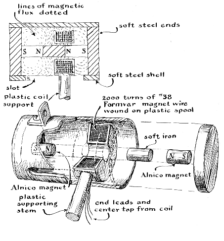 "The advantage of this arrangement lies in the fact that the slits coincide with each swing at the instant representing the mean time of the two pendulums. If for any reason the phase of one pendulum is slightly more than 180 degrees ahead of the other, it will pass dead center a bit too soon; however, the other pendulum, approaching from the opposite direction, will be a bit late. The slits will pass at the same instant that coincidence would have occurred if the phase displacement had remained exactly 180 degrees and they had passed dead center at the same instant. "Since the two pendulums are normally swinging in opposite directions at any given time, any small seismic or other disturbance that speeds one up is apt to slow the other down by the same amount, but the mean time of the two remains the same. Moreover, if such a disturbance occurs, the system is corrected automatically. The two voltage-pickup coils are connected in series, so that the net voltage fed to the amplifier, and the resulting current in both drive coils, are in phase with the correct mean time of the two pendulums. This makes the driving force lead the slow pendulum and lag the fast one, causing them to pull back into synchronization. "Furthermore, if the phase angle is not exactly 180 degrees, a slight horizontal movement of the support occurs, which also produces a synchronizing force. Two pendulums hanging from a half-inch steel bolt in a stone wall were found to lock into step in opposite phase and to swing at their average rate, even if their individual periods differed as much as five or six seconds per day. The vanes from front to back. An oversize beam eliminates the need for fussy adjustments and allows the same amount of light to reach the photocell even if slit coincidence does not occur exactly at dead center. A lens beyond the slits focuses the light on the photocell. The electrical impulse from the cell is displayed on an oscilloscope, along with radio time-signals, for accurate comparison. If the slits are quite narrow, a photomultiplier tube may be required. The pulse may be made as sharp as desired to give extremely accurate time comparison, and can, of course, operate a chronograph if sufficiently amplified. "The advantage of this arrangement lies in the fact that the slits coincide with each swing at the instant representing the mean time of the two pendulums. If for any reason the phase of one pendulum is slightly more than 180 degrees ahead of the other, it will pass dead center a bit too soon; however, the other pendulum, approaching from the opposite direction, will be a bit late. The slits will pass at the same instant that coincidence would have occurred if the phase displacement had remained exactly 180 degrees and they had passed dead center at the same instant. "Since the two pendulums are normally swinging in opposite directions at any given time, any small seismic or other disturbance that speeds one up is apt to slow the other down by the same amount, but the mean time of the two remains the same. Moreover, if such a disturbance occurs, the system is corrected automatically. The two voltage-pickup coils are connected in series, so that the net voltage fed to the amplifier, and the resulting current in both drive coils, are in phase with the correct mean time of the two pendulums. This makes the driving force lead the slow pendulum and lag the fast one, causing them to pull back into synchronization. "Furthermore, if the phase angle is not exactly 180 degrees, a slight horizontal movement of the support occurs, which also produces a synchronizing force. Two pendulums hanging from a half-inch steel bolt in a stone wall were found to lock into step in opposite phase and to swing at their average rate, even if their individual periods differed as much as five or six seconds per day. The proposed mounting has considerably higher resilience than such a bolt, making the synchronizing force even greater. During experiments with the single Shortt pendulum ( using synchronized revolving weights as described above) it was found that the pendulum could be driven by the motion produced by the weights alone. The necessary lead angle of the weights was only about five degrees greater than 180 degrees when the air in the clock case was at a pressure of a few centimeters of mercury. "Bush has made a complete mathematical analysis of the synchronizing force produced by slight support movement and has applied this same principle to the synchronization of the two opposed pistons of a free-piston engine. There energy is transferred primarily by means of gas bled through small pipes from one end of the cylinder to the other, but the basic principle is the same. This makes it possible to keep the two pistons in opposite phase without mechanical linkages. "A. L. Rawlings, the noted horologist, suggested that instead of using moving coils, with connections made through fine springs near the point of support of the pendulum (as was done with the electromagnetic drive described last month), the arrangement be reversed: fixed coils react with magnets that move with the pendulum. He cited the advantage that such a magnet system would :, maintain constant weight and dimensions over long periods of time, whereas coils of insulated wire may gain or lose weight and thus change the rate. "Recently it has been possible to work out a practical adaptation of this suggestion. The great difficulty is that any magnetic system with an appreciable external field would not only attract the magnets on the second pendulum but also would induce eddy currents in it and in any nearby stationary metal, thus absorbing energy from the pendulums and influencing their rates. "The proposed design, however, provides a magnet system so completely self-shielded that essentially no lines of magnetic force escape to interact with nearby metal. These structures can therefore be mounted directly on pendulums. Of course strong nearby magnetic f