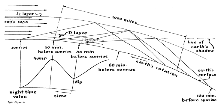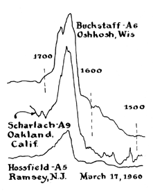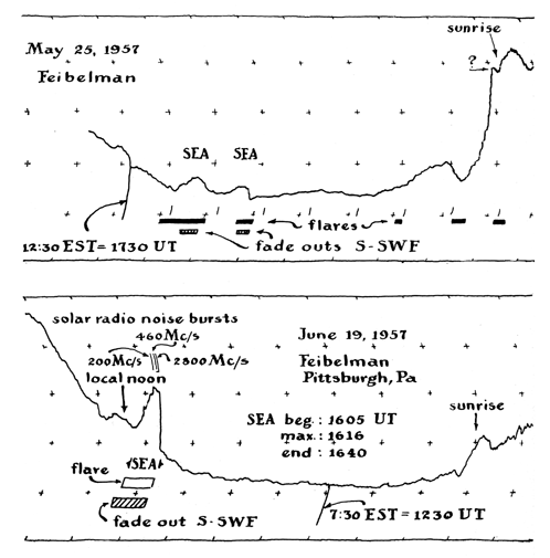 "While these installations were on trial C. H. Hossfield of Ramsey, N.J. assembled an apparatus of his own though situated well within the metropolitan area of New York City, this station has made the clearest records submitted by our patrol. For some reason Ramsey is relatively free of man-made electrical disturbances. "By the end of 1957 Justin Ruhge, a physicist of China Lake, Calif., had built a Warshaw flare-recorder and set it up for automatic operation in an isolated desert shack. His station, the southernmost in our group, records SEAs of the highest amplitude as well as those with the greatest change in signal level between night and day. Recently Stanislaus Scharlach, a Dominican priest who is a student of physics and spectroscopy in Oakland, Calif., completed a station and joined the patrol. Other late recruits include Harvey Hepworth of Blauvelt, N.Y., Hans Arber of Manila in the Philippines and Pierre R. Gouin, director of the geophysical observatory of University College at Addis Ababa in Ethiopia. All these observers send their records to me, and after analysis I forward the results to the Bureau of Standards and the AAVSO. "What do SEA recordings show? Typically a 24-hour graph displays high-amplitude signals during the night, followed by a low-level trace beginning at sunrise. This characteristic is explained by the formation of the D layer at sunrise. The long waves emitted by ever present thunderstorms in the tropics reach the higher ionospheric layers by an unimpeded path at night and are reflected to the surface without significant loss of energy. During the day, however, the waves must traverse the lower and lightly ionized D layer. Because of its light ionization, the D layer acts not as a reflector of electromagnetic energy at long wavelengths but as a partial absorber. This loss of energy to the D layer accounts for the precipitous dip in the recordings with the approach of sunrise. SEAs appear on the graphs during the hours of daylight, because X-rays and ultraviolet rays emitted by solar flares impinge on the D layer and increase the intensity of its ionization. The D layer then functions as a reflector, and the amplitude of recorded signals increases as shown in the accompanying graphs [Figure 2]. "An exceptionally clear SEA is depicted in the graph made by Warshaw on July 16, 1959 [Figure 3 ]. Note the sharp rise at the right side of the graph, marking the onset of the flare, and the characteristic jagged decline at the left side. This SEA was caused by the large flare shown in the accompanying spectroheliogram, made by Ben Parmenter of Spokane, Wash. Most SEA recordings take this general shape, but the magnitude and detail recorded vary with the location of the station. This is illustrated by the graphs of a flare recorded simultaneously on March 17, 1960, at Oshkosh, Wis., Oakland, Calif., and Ramsey, N.J. [Figure 4]. "Proficiency in distinguishing SEAs from other disturbances comes with practice. The observer will acquire the knack by the time he has analyzed his first half-mile of graph paper. Then the recordings can become exciting. When you spot a big flare, you can confidently predict a black-out in short-wave radio communications within 26 hours, the interval required for the cloud of electrically charged particles ejected by the flare to reach the earth from the sun. Their arrival is often signaled by auroral displays in high latitudes, the onset of magnetic storms and the more or less severe disruption of electrical communications. Unfortunately there appears to be no direct relationship between the size of a flare and the amplitude of the resulting SEA. Large flares are often accompanied by small SEAs, and the opposite is also true. "By the spring of 1957 our stations were functioning routinely. As I have mentioned, my task was to find some meaningful regularity in the seemingly random traces. One gross pattern, immediately evident in 80 per cent of the records, was the diurnal variation in signal intensity. The graph dips at sunrise, and rises with the approach of sunset. "A close examination of the sunrise traces disclosed an interesting and equally regular pattern first observed in one fortuitous sequence of recordings that spanned 14 days. These disclosed that the signal level does not drop abruptly with the approach of dawn. Instead, the amplitude wavers for about 90 minutes, during which time four characteristic elements are observed. Some 45 minutes before the local sunrise the curve has a pronounced dip. About 10 minutes later a typical hump appears. I have termed this the precursor hump. The hump gradually slopes off with the approach of sunrise. The signal intensity then falls to its daytime level. Finally, about 50 minutes after sunrise, occasional recordings show a 'post-sunrise hump' of varying duration and intensity. To the best of our knowledge this detailed sunrise pattern had not been recognized prior to the analysis of our data. "What are the implications of the pattern? Although the question is still open, Warshaw has suggested one interesting explanation. The phenomenon could be accounted for by a detached zone of low ionization that forms at an altitude of about 50 miles on the dark side of the sunrise terminator (the line between the illuminated and dark side of the earth). This zone might be described as a detached portion of the D layer. Signals reflected from a higher layer would be partially absorbed by the detached zone during their downward transit, an effect that would account for the predawn dip. Then, some 20 minutes before sunrise, the earth's rotation would advance the detached zone three or four degrees and would again establish a clear path for the reflections. The precursor hump would now appear, as the signal intensity approached its nighttime value. Warshaw suggests that the atmosphere in the detached zone may be ionized to about the normal intensity of the D layer by ultraviolet rays that proceed through the a