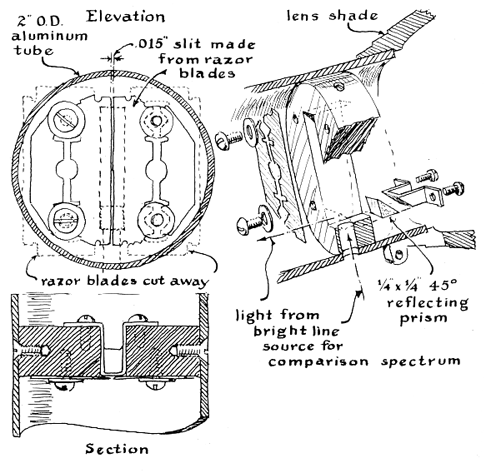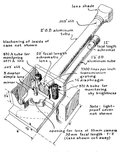"Like many amateurs," writes Feibelman, "I wanted to have a part in the IGY and volunteered to participate in the observation of auroras [see "The Amateur Scientist"; January, 1957]. The prospects for success did not seem too bright because one would not expect to see many auroras at the latitude of Pittsburgh. Moreover, industrial areas do not provide the most favorable seeing conditions. The project nonetheless turned out to be highly rewarding. Beginning with the very large and bright display on the official opening night of the IGY, I observed and photographed a total of 45 auroras by November, 1960. Others were doubtless missed because of clouds, smog or bright moonlight. No two displays were ever exactly alike, and the changing patterns and colors were always fascinating to watch. "In all I made over 700 black-and-white photographs of auroras plus 20 or so in color. Most were taken with an old camera using 120-millimeter film. The exposures were 15 seconds or less at f/2.9. I used Royal-X Pan film developed in DK 60A. The pictures were so easy to make that the novelty soon wore off, and I began to cast about for something additional to do. Eventually I hit on the idea of building an aurora spectrograph. This instrument helps to distinguish among the several kinds of aurora and reveals the presence of displays that are invisible to the eye. It is a simple apparatus, but the literature disclosed scant information about its construction. With a few hints from astronomers I wound up designing my own. "Aurora spectrographs include four basic parts: (1) a mechanical slit for admitting a thin ribbon of light to the instrument, (2) a lens for bending the diverging ribbon into a parallel beam, (3) either a diffracting or a refracting element for dispersing the collimated beam into its constituent colors and (4) a camera for recording the spectral pattern on photographic film. No telescope or other light-gathering device is used. None is needed to make auroral spectrograms. ( No illumination would be gained by bringing a small patch of the glowing area to focus on the slit. ) If desired, a telescope can be added. The instrument can then be used for photographing stellar spectra by focusing the image of a selected star on the slit. "The structural arrangement is as follows. All of the optical parts are supported by aluminum tubing and an associated housing made of aluminum plates and sheet stock as depicted in the accompanying drawing. When in use, the instrument is mounted on a conventional camera tripod. A second camera, for making widefield pictures, is mounted on an accessory bracket. The slit assembly consists of a cylindrical base that can be made of any convenient material such as aluminum, plastic or even hardwood. Two safety-razor blades are fastened to the base with screws as shown in the second drawing [above]. The cutting edges of the blades must be parallel and separated .015 inch. A rectangular hole, somewhat larger than the slit, is made in the base for admitting light to the lens. The slit assembly is mounted in one end of an aluminum tube. An achromatic lens 1 3/4 inches in diameter fits into the other end of the tube at the distance of its focal length from the slit-20 inches in the case of my instrument. Neither the diameter of the lens nor its focal length are critical. The diffraction grating is placed immediately behind the lens and at an approximate right angle to the beam, as depicted in the third drawing [below]; The grating and the back face of the lens are enclosed by a housing. A hole in the rear of the housing, which makes a light-tight fit with the lens barrel of the camera, admits the dispersed rays to the camera lens. The focusing adjustment of the camera is set at infinity. I use a 35-millimeter Retina camera equipped with an f/2 lens. The time required for exposures depends in part on the light-gathering power of the camera lens. In general, focal ratios substantially larger than f/2 are not satisfactory. "For the dispersing element I prefer a transmission (i.e., transparent) replica grating to a glass prism. A grating spreads the colors more than a prism does, and the dispersion is uniform throughout the spectrum. A spectrum made by a prism becomes increasingly crowded toward its red end. Spectral colors appear as parallel bands or lines that cross the ribbon-shaped pattern like the rungs of a ladder. Crowding obviously increases the difficulty of identifying interesting lines.