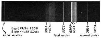 "Gratings are not without disadvantages, however. Whereas prisms disperse light into a single spectral pattern, gratings produce multiple spectra that overlap at the ends, somewhat like the 'ghost' images that appear on television screens. To minimize this effect, gratings are commonly 'blazed,' that is, ruled with V-shaped grooves that are tilted at a slight angle to deflect most of the light into one preferred image, or spectral 'order.' My grating is blazed to favor the first spectral order. The lines of this order accordingly show up more prominently in my photographs than those of higher orders. The lines of the higher orders are also more widely spaced than those of the first order, a further aid in distinguishing the first-order lines [see "The Amateur Scientist;" June, 1955, and April, 1958]. My grating was manufactured by the Bausch & Lomb Optical Co. and can be purchased through a dealer in scientific supplies. "With this combination of grating and camera the exposure time required to photograph the brightest aurora averages about 10 minutes. Good photographs have been made with Ansco Super Hypan film. The best results are obtained, however, with spectroscopic emulsions such as Kodak 103a-F, which is specially sensitized for the far-red region of the spectrum. Spectrograms have been made of several auroras that were not visible, in some cases by extending exposures to four hours. The outcome of such attempts is a matter of pure chance. You have no way of knowing if an aurora is up there. So you just point the instrument toward the northern sky at night, open the shutter and go away. With luck, spectral lines characteristic of the aurora will appear when you develop the film. "For many years auroral spectra presented investigators with something of a mystery. Certain of the lines could not be reproduced by light sources then available in the laboratory, and came to be known as 'forbidden' lines. The brightest of the forbidden lines appears in the green portion of the spectrum; it is formed by light waves that measure 5,577 angstrom units in length. This line is emitted when highly ionized atoms of oxygen in the upper atmosphere release a finite part of the energy acquired by collision with particles hurled into space by the sun. The 5,577-angstrom line is observed to some extent in all auroras. When intense, it accounts for the characteristic green color of most displays; when weak, the auroras look pale white or gray. Also characteristic are two lines at 6,300 and 6,364 angstroms in the red part of the spectrum; these also are emitted by ionized oxygen. Still another relatively prominent line is found at 3,914 angstroms in the extreme violet. It is emitted by ionized nitrogen. Weaker lines also appear throughout auroral spectra. Most are associated with the emission of energy from oxygen and nitrogen, although occasional spectrograms show a well-defined line at 6,563 angstroms that has been identified with hydrogen. "The relative intensity of the spectral pattern varies with the intensity, height and type of the display; the temperature of the upper air; the state of the earth's magnetic field, and related environmental factors. Quite often spectral lines also show variation in brightness along their length. Auroras in the early evening or morning, when part of the display is in the earth's shadow and part in the sunlit upper atmosphere, are of particular interest because not all of the accompanying effects are understood in detail. They are investigated by pointing the spectrograph toward the area in question. The techniques of analyzing spectrograms to determine the height of a display or the temperature of the air in a selected region are described in the literature [see 'Bibliography']. "Several optional features were built into the basic instrument to facilitate its operation. A small right-angle prism was added at the lower edge of the slit so that a comparison spectrum can be photographed simultaneously as an aid in the identification of unknown lines. Light from a small neon bulb is directed against the lower face of the prism for about 10 seconds. Any miniature neon bulb can be used. Neon emits particularly strong lines at 5,400, 5,852 and 6,402 angstroms. This accessory is not too important, because the 5,577 lines can always be recognized, as is apparent in the accompanying spectrogram. Incidentally, the lines may be sharpened by making the slit narrower than .015 inch. Sharpness is gained at the cost of longer exposure, however, because the light admitted to the film varies inversely with the width of the slit. Moreover, a narrow slit emphasizes the higher-order images.