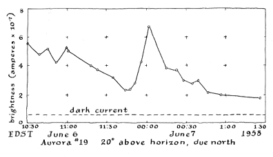 "To aid in estimating exposures and plotting variations of auroral brightness a 931-A photomultiplier tube was incorporated in the instrument. The photocathode is illuminated by a small telescope equipped with an objective lens of 1 1/2inches diameter and 12 inches focal length. The incoming light is focused on the photocathode through a diaphragm 1/2 inch in diameter that limits the illumination to a patch of aurora about five degrees in diameter. The output of the phototube actuates a microammeter. Brightness is indicated simply by the movement of the pointer. If an ultrasensitive meter is used, so that a current of 10 microamperes drives the pointer to full scale, no amplifier is necessary. If not, the circuit must include a direct-current amplifier. Warning: The 900-volt supply for the photomultiplier can be lethal if handled carelessly. The tube and all parts of the circuit must be well insulated from the metal housing, no bare wires or terminals can be exposed. The instrument is used in darkness, a condition that invites accidents. "A meter of the pen-recording type would be preferable because it would plot a continuous graph of brightness against time automatically. I have not, however, invested in one. The accompanying graph of a typical aurora was plotted by hand from periodic meter readings. The display was of medium intensity and showed a strong peak at midnight. The spectrograph was pointed due north and about 20 degrees above the horizon. The early portion of the record doubtless includes some twilight. The photomultiplier tube draws a small amount of current even when no light falls on the photocathode, an effort that establishes the minimum illumination to which the tube is sensitive. It is called the 'dark current,' and is indicated on the graph by the horizontal broken line near the bottom.