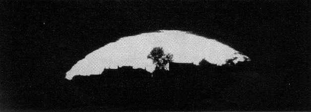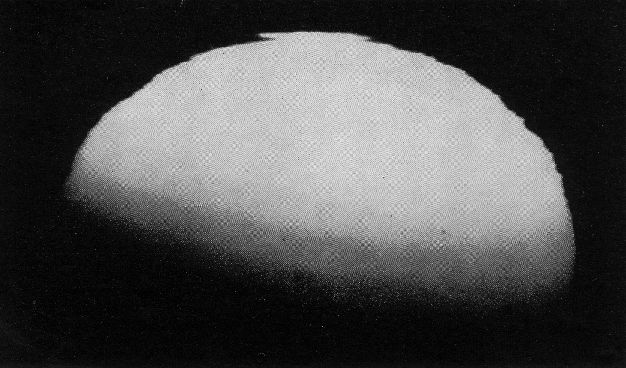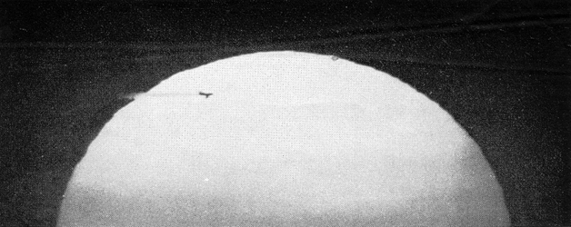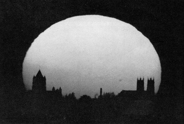 "A second 931-A photomultiplier is being added to operate an alarm system during sleeping hours. It will be actuated by light dispersed to the side of the axis opposite the camera location. The characteristic green line at 5,577 angstroms is focused by a small lens on a second slit that excludes all other light from the photomultiplier. For mechanical compactness the beam is folded by a small front-surfaced mirror that can be rotated during initial adjustment to center the 5,577 line on the slit. The output of the photomultiplier is amplified for operating a relay that in turn triggers an alarm when the 5,577-angstrom line reaches a predetermined intensity. "As a consequence of working with the auroral spectrograph I became interested in other optical phenomena of the atmosphere, in particular the green flash that is occasionally observed at the upper edge of the setting sun [see "The Green Flash," by D. J. K. O'Connell, S. J.; SCIENTIFIC AMERICAN, January, 1960]. Somehow I had gained the impression that observation of the green flash requires a large telescope, exceptionally good seeing and the smooth horizon of a large body of water or a desert. This proved not to be the case. The accompanying photographs were made with modest equipment through an industrial atmosphere in a hilly region. "During the past 18 months scores of such photographs have been made from the eastern side of Pittsburgh, overlooking the downtown area about eight miles away. Green and red flashes have been observed on numerous occasions, and almost every evening the sun has a green rim at the top and a red rim at the bottom. Green flashes have been seen as long as half an hour before sunset, as I well as when the sun was partly below the horizon. In several cases green flashes have been seen and photographed even when the bottom edge of the sun was immersed in thick haze. Smoke and haze cause a pronounced reddening. Of the solar disk, however, and dilute the green flash with yellow. On exceptionally clear days the green flash appears bluish; on one occasion it was a deep violet. The phenomena are most pronounced when an abrupt drop in temperature follows several days of uniform weather. Incidentally, distortions of the solar disk at sunset can be used for predicting astronomical seeing for the night: the better the green flash, the worse the seeing will be. "All the photographs have been made with an achromatic lens of two inches in diameter and 50 inches focal length. The lens is mounted in one end of an aluminum tube; a 35-millimeter camera (with the lens removed) occupies the other end. Originally I used a small homemade camera box equipped with a Compur shutter of 1/500 second maximum speed. Pictures made with this equipment showed a five-cornered star pattern that was traced to nonuniform motion of the five leaves of the shutter. This difficulty was solved by replacing the homemade camera with a Leica equipped with a focal-plane shutter. The complete assembly is mounted on a conventional tripod that rests against a window sill for added support. "A reflex attachment is useful both as a view finder and when making the initial adjustment, but it is not essential. Once the focus is established at infinity, you are in business. I made a provision for inserting filters ahead of the lens, but this feature has never been used. An iris diaphragm was mounted ahead of the lens. It is useful for reducing brightness when looking at the sun through the reflex attachment. Warning: Care must be exercised when looking through the instrument at the sun, particularly when the sun is at an appreciable elevation. Serious eye injury can result. The illumination must be reduced either by means of an iris diaphragm, a dark filter or some optical arrangement that diverts most of the rays from the eyepiece. "Most green flashes are observed when the sun is near the horizon. The accompanying photographs show that extremely low elevation is not a critical condition for the phenomenon. One of the pictures [Figure 6] shows a green flash (the narrow sliver of light at the top of the disk) just coming off the limb. Note that the bottom of the disk is immersed in smog. This picture was made on November 15, 1959. The second photograph shows a green flash at the moment of detachment from the disk and after a substantial portion of the sun has disappeared below the horizon. The silhouetted buildings in the photograph are about eight miles away. "The third photograph shows a red flash that was detached from the bottom edge of the sun after the disk had been grossly flattened by atmospheric refraction. Such flashes separate from the disk abruptly, float free for an instant and then merge with the disk. Sometimes they resemble a suspended bubble. "Occasionally the camera records large sunspots. One is seen in the fourth photograph above the rear of the cathedral at the right. The buildings are about 10 miles away. "By good fortune the Greater Pittsburgh Airport happens to be situated on the west side of town, about 20 miles distant, and planes coming in for landings or taking off frequently cross the sun's disk. The exhaust gases always appear to be illuminated for a couple of seconds when the plane comes out of the sun, creating the impression that the plane has sliced out part of the disk and is dragging it away. The illusion is particularly pronounced in the case of jets. When the camera is replaced by an eyepiece, the hot exhaust gases are seen to be responsible for optical effects that are altogether comparable to the green, red and violet flashes. "The last photograph [below] shows the phenomenon in black and white. These effects can originate quite close to the observer. One evening I watched a Constellation that was flying directly into the sun. Knowing that the wingspread of the plane is 126 feet and that the solar disk subtends an angle of about half a degree, it was easy to calculate that the plane was some 2 3/4 miles away. Suddenly, at 