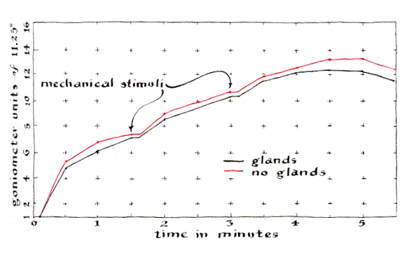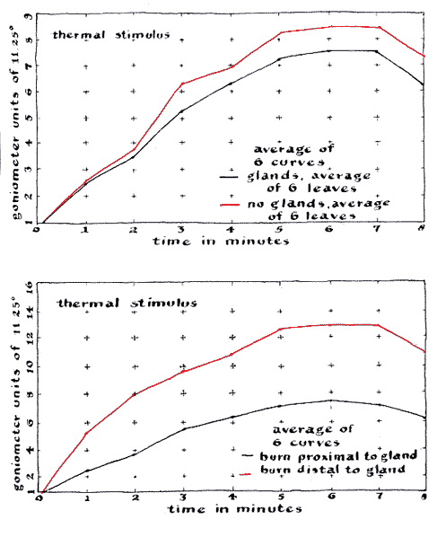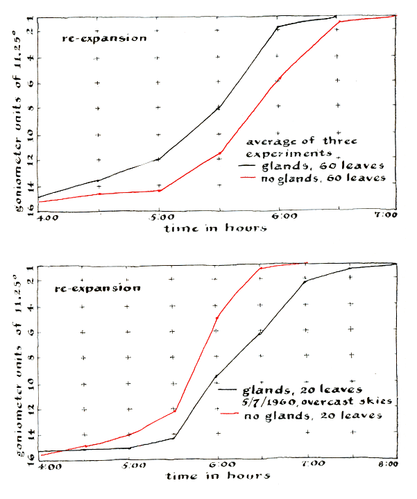 "Subsequently I ran another series of 11 tests with a different set of plants to check the rate of re-expansion in the morning. The plants were similarly prepared but were shifted to a window with a southeast exposure. The experiments were made in May, 1960, beginning in total darkness at about 4 a.m. The plants I without glands were observed to open at a substantially lower rate than the controls, less than half as fast during the initial phase, and required 30 minutes longer than the controls to open fully [see top illustration Figure 7]. The most interesting response, however, was observed on May 7. In contrast with the previous sunny mornings, there was intense rain and the sky was heavily overcast. The plants with glands opened at a much higher rate than those without glands and were fully open an hour earlier. I can think of no reason for this reversal in behavior, and so far I have not managed to get any counsel concerning an explanation. The data plotted in the next illustration [bottom of Figure 7] represent the average of observations made over a period of three days in the case of the glandless plants but of only one day in the case of the controls. "The crop was at its best during May and June. An abundance of large leaves provided an excellent opportunity to test the effects of an acid, an alkali and alcohol as stimulants. Sulfuric acid was prepared in three concentrations for the experiment by adding 12 grams, 144 grams and 588 grams of acid respectively to three vessels, each containing one liter of water. Comparable dilutions of ammonium hydroxide were prepared for the alkali solution. A single dilution of 85 per cent ethyl alcohol (by volume) was used. The stimulants were applied to the glands and petioles with a swab made by wrapping a few strands of cotton on the roughened tip of a dissecting needle. "The plants, grouped and prepared as in the earlier experiments, displayed a barely detectable reaction to the weakest dilutions of acid and alkali. The intermediate concentration triggered a more obvious response: movement started in the leaflets closest to the stem of the plant and gradually progressed up the midrib to the terminal pairs. The rate of movement was perceptibly higher in the leaves with glands but in all other respects the reactions of both groups were identical.