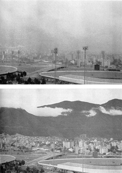 "Early in the study I found a few salt crystals and immediately concluded that I had hit the full explanation of the calina. My theory was simple: The strong, steady trade winds that blow over the Caribbean, whipping up whitecaps and the large waves that break along the Venezuelan shore, raise a cloud of droplets that make up the sea spray; this spray is carried inland by the wind in great volume; as the water evaporates from the droplets in the atmosphere, tiny salt crystals are formed that, being very small, float away with the wind. These crystals, I assumed, were the nuclei of the calina droplets. "But, as usual in these cases, what at first appeared simple became more complex as I probed deeper into the problem. Careful examination of the slides soon disclosed that I was catching not only salt crystals and other things to be expected in the air, such as grains of pollen, dust, vegetable fibers and fragments of insects, but also a great number of tiny spherical particles evenly distributed on the slides and almost invisible in the Canada balsam. The particles were a few microns in size (a micron is one thousandth of a millimeter), too small for identification by ordinary optical methods. They were present on all the slides. My theory did not explain these particles. "In an effort to gather more evidence I sought the help of friends who were flying or driving to the interior; I gave them slides, cover glasses and balsam and detailed instructions on how to collect the particles. I made two special flights over Caracas to gather more material, take pictures and record the temperature and relative humidity of the air in the thick of the calina. The temperature was between 28 and 80 degrees centigrade (82.4 to 86 degrees Fahrenheit), and the relative humidity was 40 to 45 per cent at 5,000 feet-much hotter and drier than normal. During the 'noncalina' portion of the year the average relative humidity in Caracas is 89 per cent at 7:00 a.m., 64 per cent at 1:00 p.m., 89 per cent at 7:00 p.m. and 93 to 98 per cent during the night.