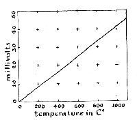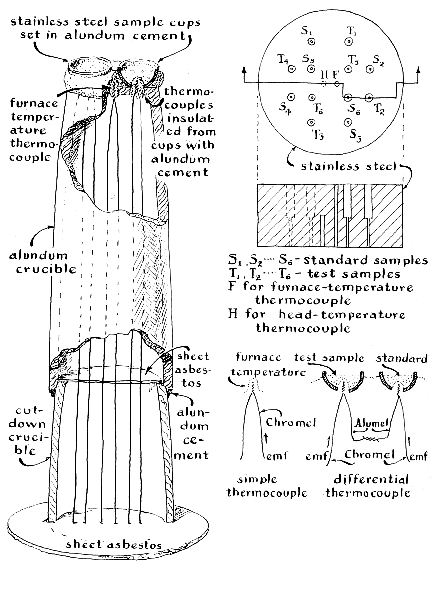 "The analysis of clay requires thermocouples that can withstand repeated exposure in air to temperatures on the order of 1,000 degrees. Ours were made of two special alloys: Chromel-P and Alumel. Chromel-P is 90 per cent nickel and 10 per cent chromium. Alumel is 94 per cent nickel, 2 per cent aluminum, per cent magnesium and 1 per cent silicon. The alloys are produced by the Hoskins Manufacturing Company in Detroit and are available in the form of No. 22 gauge wire from the Edmund Scientific Corporation in Barrington, N.J., in minimum quantity for $1. Chromel-Alumel thermocouples develop a potential difference of approximately one millivolt for each 28.2 degrees C. of temperature difference between the junction and free ends, as shown by the top graph on the right. Electrons flow from Chromel to Alumel inside the junction. "Thermocouples can be connected in pairs to indicate the difference in temperature between two objects by splicing one set of similar leads together, such as the Alumel pair, as shown at the lower right in the illustration in Figure 2. When the junctions of two thermocouples so connected are at the same temperature, the electrical outputs cancel and no potential difference appears across the Chromel leads. When the junctions are at different temperatures, the thermocouple action of the hotter unit exceeds that of the cooler unit and a voltage appears across the Chromel leads that varies in direct proportion to the temperature difference. Adjacent holes of our specimen holder were equipped with pairs of thermocouples connected for measuring differential temperature. A single thermocouple was installed in the holder for measuring the temperature of the stainless steel block and a second one was extended above the holder for sensing furnace temperature. Care was taken to center the units precisely in the holes so that the junction would not heat unevenly and generate false temperature indications. The Chromel and Alumel leads were insulated by small tubes of alundum and were fastened in the specimen holder by alumina cement. "The output voltage can be measured either by a voltmeter sensitive to a billionth of a watt and calibrated to 50 millivolts or by pen recorders equipped with appropriate amplifiers, depending on the experimenter's budget. We used a battery of pen recorders and synchronized the speed of the charts with the rate at which the furnace heated by means of an electronic program controller. The controller operated automatically and could be adjusted for any desired rate of heating up to 50 degrees per minute or for holding the furnace at any fixed temperature. A heating rate of 12 degrees per minute resulted in the most clearly defined peaks. Ample information on all specimens appeared in the temperature range from 100 to 1,050 degrees C. Higher temperatures added little of interest to the graphs and reduced the life of the coil and the thermocouples. "The operating procedure is simple. Specimens are prepared by dry grinding with a mortar and pestle. The specimen holders are filled with ground material that passes through a sieve consisting of 50 crossed wires per inch-a standard 50-mesh screen. The powder is poured into the holes loosely; tamping appears to have little effect on the results, and tightly packed specimens are difficult t o remove at the conclusion of a run. The companion hole associated with each specimen is charged with inert comparison material. We used powdered alumina that passed a 60-mesh sieve. Once the: samples are inserted and the thermocouples are connected, the furnace can be started. "We adopted a standard procedure for plotting and interpreting the curves. Temperature fluctuations are plotted upward when the specimen emits heat and gets hotter than the comparison material, as a consequence of exothermic (heat-emitting) reactions, and are plotted downward when it absorbs more heat than the comparison material, during endothermic (heat-absorbing) reactions. "Reactions of one type or the other may occur for a variety of reasons, including loss of absorbed water and water of crystallization, release of the hydroxyl radical (OH) from the crystal lattice, transitions in the structure of the crystal lattice, the loss of carbon dioxide from carbonate compounds, the devolatilization of coals and oil shales, and the oxidation of sulfide compounds and uranium-bearing shales. The temperature of the furnace is plotted horizontally on the graph; fluctuations of specimen temperature are plotted vertically. The area enclosed by fluctuations or peaks in the graphs varies in proportion to the amount of thermally active mineral involved in the reaction. Mixed specimens can be analyzed by measuring the area enclosed by a selected peak and dividing it into the area of an equivalent peak of a pure specimen that has been measured with the same apparatus. The ratio represents the amount of the known mineral that is present in the mixed specimen.