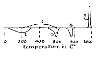 "At least five basic types of temperature fluctuation occur, each of which produces a typical curve [see second graph from top at right]. Broad, low endothermic variations between 100 and 300 degrees C. (1) indicate loss of absorbed water. Broad exothermic curves (2) signify the oxidation of organic matter in clays between 200 and 600 degrees. The loss of lattice water between 450 and 700 degrees yields curves (3) with a broad base. Carbonate reactions show large asymmetrical deflections (4) between 450 and 900 degrees. The comparable narrow, high-amplitude exothermic peaks that correspond to transformations in the structure of the aluminum-based part of the molecule occur near 1,000 degrees (5). "A number of the gangue minerals (waste materials in ore deposits) also exhibit interesting reactions [see third graph from top at right]. The crystalline structure of quartz, for example, undergoes an abrupt endothermic transformation at 575 degrees C. that appears as a dip in the differential curve so sharp and reproducible that it can be used for calibrating thermocouples. (Fairly pure quartz sand for calibrating thermocouples can be taken from the little sandglasses sold as egg timers by novelty stores. Colored sand may also contain quartz, but the impurities often introduce reactions that mask the endothermic peak at 575 degrees. Calcite, also a gangue, shows an endothermic peak between 800 and 900 degrees when carbon dioxide is evolved. Two peaks characterize dolomite, one indicating the release of carbon dioxide from the magnesium ion in the vicinity of 750 degrees and another from the calcium ion at 860 degrees.