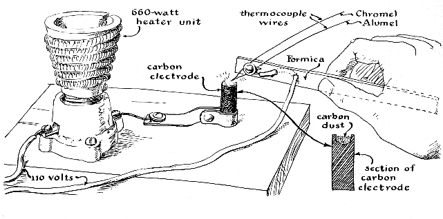 "Our specimen holder was machined from a two-inch length of cylindrical stainless steel three inches in diameter. Twelve 34-inch holes for the specimens were drilled into one face of the block to a depth of one inch. Each hole was then drilled the rest of the way through the block with a 1/8-inch drill as shown at the upper right in the drawing on the left. An additional 1/8-inch hole was drilled through the center of the block and a second one, about inch off center, was drilled into it to a depth of one inch from the opposite face, as shown. The small holes admitted thermocouples for measuring the temperature of the specimens, furnace and specimen holder respectively. The specimen holder was supported in the center of the furnace by a hollow cylinder of alundum. "Thermocouples are easy to make. Twist the ends of two wires of dissimilar metal around each other two or three times. Snip off the excess and clip the free ends to one side of a 110-volt source. Then dip the twisted ends momentarily into a metal bowl of mercury connected to the other side of the circuit. The resulting arc will melt the wire ends into a bead that constitutes a butt weld. The diameter of the bead should be about twice the diameter of the wire. Any two dissimilar metals will exhibit thermocouple action; the most satisfactory are those that develop a relatively high voltage that increases in direct proportion to differences of temperature between the welded junction and the free ends.