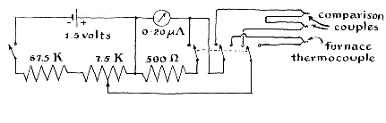 This department shares Smith's enthusiasm for differential thermal analysis. It is a fascinating experiment, both to set up and to run. Not all of us have access to electronic programmers and expensive pen recording systems, however, and even such prosaic materials as three-inch cylinders of stainless steel are not easy to pick up. Nonetheless, with a few tips from Smith I have just built a primitive model of his apparatus. It cost only $20 and it worked very nicely. The principal outlay went into a piece of two-inch alundum tubing for the furnace liner (obtained from the Fisher Scientific Company, 638 Greenwich Street, New York 14, N.Y.) and thermocouple wire. All Smith's suggestions for constructing the furnace were adopted except one: the paint bucket was not equipped with Transite ends. This was a mistake. Heat buckles the tin and pulls it away from the muffle, and the ends are now being replaced by Transite. The alundum tubing was wound with Nichrome wire removed from a pair of 660-watt radiant-heater units bought at a local electrical-supply store. Each element has a 1/8-inch helical spiral winding. When the spiral is removed from the element, the wire can be straightened by slipping one end of the helix over the point of a shingle nail (held in a vise) and pulling the free end away from the nail. The straightened wires from two radiant elements are twisted to form a pair, then wound on the alundum tube. The ends of the wound coil are clamped to the alundum tube by narrow metal bands as shown in the illustration in Figure 7. I did butt-weld one thermocouple with a mercury arc as Smith suggests. In making such welds a ballast resistor must be connected in series with one lead to limit the current; I used a 660-watt radiant-heater unit, as shown in the drawing below. But when a mercury arc is struck, a small, yellowish cloud of highly toxic mercury vapor rises, a whiff of which could land the experimenter in the hospital. It is better to make the welds with a carbon arc, a more difficult procedure but one that can be mastered with practice. Remove the carbon rod from a size D flashlight cell and wash it thoroughly in strong soap and water. Since an arc will not be sustained between the wires and solid carbon at five amperes (the current passed by the ballast resistor), first drill an axial hole slightly smaller than the diameter of the rod into one end to a depth of about 34 inch. (The rod is so soft that you can make the hole by twisting the bit with your fingers.) Save the drillings and tamp them into the hole. Then strike the arc between the thermocouple wires and the solidly packed carbon dust. The small cloud of carbon dust kicked up by the arc seems to conduct just as well as mercury vapor. The job is made still easier, and better welds result, when a flux of borax is applied to the wires before striking the arc. Just moisten the twisted ends and dip them into powdered borax of the 20 Mule Team variety that is found in most kitchens. Try to control the arc so that the twisted ends melt into a bead about the size of a pinhead. Make a few practice welds with Nichrome wire from a heater unit until you acquire the knack. The potential difference across Chromel-Alumel thermocouples varies from approximately zero volts at room temperature to 45 millivolts at 1,050 degrees C., as shown by the graph in Figure 4. The short-circuit current of the thermocouple reaches a maximum of about 30 microamperes at 1,050 degrees. The maximum output power of the device at this temperature is on the order of one microwatt. To hold costs down I measured the output voltage directly and did not attempt to amplify the current. The measurements were made with the potentiometer circuit shown above. The potentiometer was of the large, wire-wound precision type currently available on the surplus market for $1. The fixed resistor is of the carbon type and rated at 1/2 watt. The circuit is energized by a single flashlight cell. The voltage of the cell should be determined while under load by an accurate voltmeter. The dial of my potentiometer turns through 270 degrees and is calibrated in 20-minute intervals of arc. A tenth of the cell voltage (.152 volt) appears across the potentiometer. So each scale division equals .00018 volt. The thermocouples are connected through a double-pole, double-throw switch to the arm of the potentiometer and the positive terminal of the battery so that the thermal current opposes that of the battery. A 0-20 microammeter of the flush-mounted type is included in the common circuit to indicate the direction of current flow. It was converted to function as a sensitive galvanometer by cementing to the pointer a small mirror that reflected a beam of light to a screen 10 yards away. To make the conversion, remove the movement from the case and carefully bend the pointer back over the pivot bearing in the form of a hairpin loop. Center a 1/8-inch square of glass broken from a silvered microscope cover slip above the pivot and cement it there. The movement is then mounted for protection in a box fitted with a window of reasonably flat glass, such as is used for photographic plates. I used a 85-millimeter slide projector as a light source. With the potentiometer set at zero, the switch is thrown to connect any cold thermocouple. The position of the beam on the screen is then marked "zero." When heat is applied to the thermocouple, the beam will drift to one side. It is returned to zero by rotating the potentiometer arm. The temperature of the thermocouple is then computed by multiplying the voltage, as indicated by the position of the potentiometer arm, by 23,200. The potentiometer scale can be calibrated directly in degrees centigrade if desired. I could not locate stainless steel cylinders of the size specified by Smith. So I improvised a one-specimen sample holder out of two stainless steel tablespoons, hammering the bowls into small cups by heating the spoons with a torch and graduall
