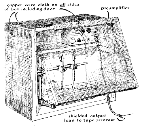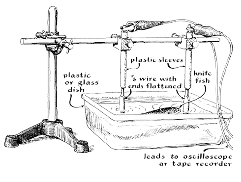 Camougis says that a number of materials can be used for electrodes. Heavy copper wire about l/8 inch in diameter works well for picking up currents from frogs and small fishes. (Brass, lead, soft iron and carbon can also be used.) The wire is cut into convenient lengths of about six inches. The ends can be flattened to provide a greater surface area. The wires are then insulated with several layers of quick-drying nail polish, except for the flattened part and about half an inch at the opposite end, where the leads are to be attached. Sleeves of plastic or rubber tubing are slipped over the wires as mechanical protection against the iron clamps used to support the electrodes in the water. A glass dish or other nonconducting vessel of appropriate size can be used as the container for the animal and water. The bare upper ends of the electrodes are connected by alligator clips to the input leads of the recording system, as shown in the illustration in Figure 1. The electrical potentials normally picked up are so small that high-gain amplification is required. Stray fields set up by alternating-current power lines, by appliances and even by nearby radio stations can induce currents in the input leads almost as strong as the desired signal. Shielded cages that house the electrodes, the water container and a preamplifier have therefore become standard equipment for electrophysiological work. The shielded cage can be a plywood box covered on all sides with bronze or copper screening. It should have a hinged door on one side for access to the specimen and apparatus inside. It is essential that the door screening make good electrical contact with the rest of the shielding. Convenient dimensions are 30 by 20 by 20 inches, the door being 30 by 20 inches [see illustration above right]. The cage must be grounded, preferably to a nearby water pipe. The characteristics of the amplifier and instrument required for displaying the electrical potentials are determined by the electrical phenomena to be investigated. When observing the action potentials of aquatic arthropods, a high-quality preamplifier capable of multiplying the input signal 10,000 times is essential. Capacitance-coupled, battery-operated preamplifiers are satisfactory, although direct-current preamplifiers must be used in the case of signals of very low frequency. A cathode-ray oscilloscope can be used to display the potentials and, along with the amplifier, should be grounded to the shielded cage. Any good oscilloscope will work, including the better kit models. The technical problems of recording animal electricity vary inversely with the amplitude of the potential picked up by the electrodes. The potentials developed by some fishes, for example, can be fed directly into an oscilloscope of only moderate sensitivity, and the specimen need not be shielded. When the experimental animal in the container remains still, the horizontal trace of the oscilloscope is a steady, straight line. When the animal moves, peaks of varying form and amplitude appear that correspond to variations in the electrical field induced in the water by the animal. These potentials are caused mainly by muscle action. When the crayfish is used as an experimental animal, for example, the amplitude of the action potentials is on the order of 50 to 100 microvolts. The amplitude of the deflections increases when an animal moves close to the recording electrodes. Surface oscillations of the water also induce spurious excursions in the trace, but these are normally of low amplitude and do not confuse the observations, particularly in the case of animals that move slowly. Since most of the electrical phenomena recorded are fast transients that span no more than a few thousandths of a second, ordinarily no difficulty arises from electrochemical reactions between the electrodes and the water. When observing animals that develop substantial direct currents, however, it is advisable to use silver electrodes that have been immersed in salt water for a few minutes while connected to a six-volt source. The process coats the electrodes with a protective film of silver chloride. The voltage that appears across the electrodes varies with the resistance, and hence the purity, of the water. Impure water, which contains ions, provides a good path for the currents and tends to "short-circuit" the animal. This presents no problem in the case of large potentials, such as the electric discharges from knife fishes. But if one is to record muscle action potentials from crayfish and smaller creatures, the specimen must be in distilled or deionized water. A variety of bioelectrical phenomena can be recorded by this method. Muscle action potentials are readily detected. Crayfish, for example, react as if startled when a bright light is suddenly turned on them. How much time elapses between the instant when the light comes on and the response of the crayfish? The interval is difficult to time accurately by eye. But it shows plainly on the oscilloscope. Experiments of this sort are made easier and still more interesting by the addition of an audio system so that the action potentials can be heard as well as seen. Just hook any good audio amplifier across the output of the preamplifier (in parallel with the input to the oscilloscope) and feed the amplified signal into a loudspeaker. Aquatic insects such as the corixids (water boatmen) also make interesting subjects. Periodic bursts of electrical activity are clearly noted, synchronized with readily observable movements of the locomotory appendages. Such swimming movements have not been extensively investigated because heretofore the available techniques of observing the movements required bright lights, mechanical attachments and related apparatus that tended to modify natural behavior. Any muscle that contracts in the water generates a signal that can be detected with the aid of an amplifier having sufficiently high gain and not so noisy that the s