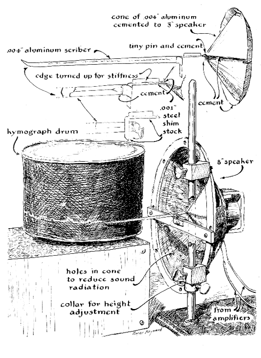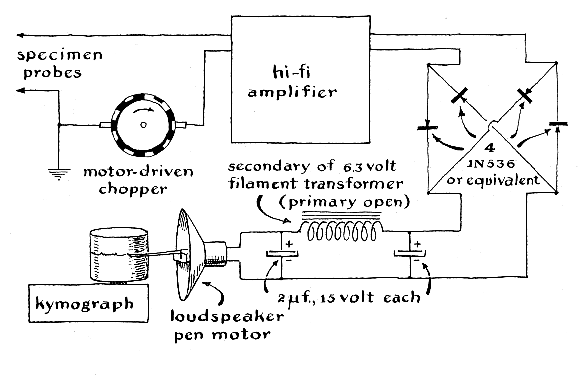 "In summary," Camougis writes, "the method of observing the bioelectric effects associated with aquatic animals has the obvious advantage of simplicity and provides perhaps the only practical method of studying motor responses of animals that must not be mechanically impeded because of their behavior, delicate structure or small size. A disadvantage of the method is that it doesn't localize the electrically active site. In this respect it is not intended to replace the techniques that involve inserting a fine electrode directly into the tissue being studied. It is a method of investigation at an entirely different level -studying the behavioral responses of intact animals by means of simple apparatus. The stagnant pond in back of my home teems with Daphnia, and last summer our hi-fi set was not fully engaged. So I dug up a packing box big enough to hold a preamplifier and a microscope and covered it with old copper screening. A hole was made in the screening to admit a microscope eyepiece for examining specimens through a 90-degree prism. My plan was to place a single Daphnia in a drop of water on a microscope slide and pick up the action potentials by inserting a pair of small copper wires into the drop from opposite sides. These electrodes would feed the battery-powered preamplifier inside the cage. I decided to try out the arrangement by means of a loudspeaker before connecting the oscilloscope. The construction went smoothly enough, and when the amplifiers were switched on, ample power appeared at the output-all noise, consisting mostly of 60-cycle hum. The cage leaked noise like a sieve. Still more was picked up by the circuits because I had neglected to ground the main amplifier and had failed to solder the screening where it came together at the corners. The tarnished wire would not take solder, so I re-covered the box with new screening. I found that the door screening must make good electrical contact with the box screening every few inches around the edge, and that all ground connections must come together at a single point. These corrections eliminated the 60-cycle hum, but the character of the random noise did not change although I tried every available kind of water-distilled, deionized, tap, rain and pond. Finally I hit on the idea of reducing the size and shape of the specimen container. I softened a glass tube in a gas flame and pulled it into a capillary with a bore just slightly larger than the animal. Then I put a drop of distilled water containing a single Daphnia on a microscope slide and "speared" it with the glass tubing. Capillary attraction made the drop rush into the tube and carry the specimen along with it. Snapping off a half-inch length of tubing containing the specimen, I pushed fine wires into the ends far enough to make contact with the water. The junctions between the wires and the ends of the glass were sealed by dabs of silicone grease and the assembly was pressed against the sticky side of Scotch tape to secure the leads. It worked! The oscilloscope displayed the heartbeats clearly during instants when they were not obscured by other muscle action. I wanted to make a permanent record of the oscilloscope display. Like most other amateurs, however, I do not own a pen recorder. It occurred to me that perhaps a loudspeaker could be modified to act as a pen motor if a lightly hinged arm was simply attached to the driving coil of the cone. Roger Hayward, who illustrates this department, fashioned a pen lever from heavy aluminum foil and equipped it with a hinge in the form of a steel reed cut from shim stock about .001 inch thick, as shown in Figure 3. The reed was clamped between the head of a machine screw and a piece of strap aluminum that was bolted across the face of the metal frame that supports the cone assembly. The pen lever was driven from the side opposite the hinge by a second length of shim stock that was attached by epoxy cement to the apex of a cone made from heavy aluminum foil. The base of the aluminum cone was cemented to the paper cone of the loudspeaker over the driving coil. The first model was promptly wrecked. The violent vibration of the cone broke the hinge attachment. A full-wave rectifier and a smoothing filter were then inserted between the output of the amplifier and the loudspeaker pen recorder [see Figure 4]. The arrangement worked nicely at frequencies between 20 and 30 cycles per second, the lower frequency limit of the amplifier. To record still lower frequencies, I then inserted a chopper-a motor-driven switch-between the output of the preamplifier and the hi-fi amplifier. The chopper was a modified motor generator of the type used to step up the voltage of storage batteries for powering radio sets used in military aircraft. The armature windings of the generator were cut loose from the commutator, and alternate bars of the commutator were connected together. The commutator of my unit, which was picked up on the surplus market for a dollar, had f39 bars. The odd bar was not connected. The circuit to be chopped was simply connected in series with the brushes on the generator side. I found that copper-impregnated brushes introduced less noise in the chopper circuit than the graphite brushes with which the unit was originally equipped. At its normal operating speed of 6,400 revolutions per minute, the chopper converted direct current to alternating current at a frequency of about two kilocycles. The end of the pen lever was bent at a right angle to act as a stylus and was supported against the smoked cylinder of a motor-driven drum recorder, or kymograph, by an apparatus stand. (For data on constructing a homemade kymograph see The Amateur Scientist; SCIENTIFIC AMERICAN, April, 1960.) With this apparatus I succeeded in making a number of electrocardiograms of Daphnia and of other small animals, including frogs. At least I call them electrocardiograms. Actually they are rather smooth waves that appear in step with the heartbea