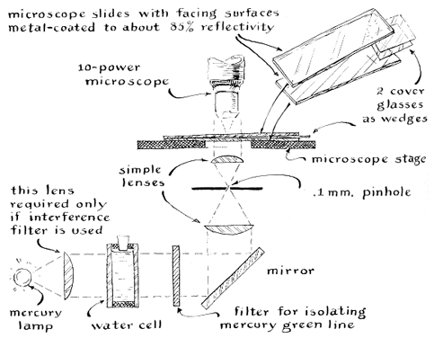 Brackets for supporting the lenses, the water cell and the filter can be improvised from scrap sheet metal and attached to a firm wooden base, on which the microscope also rests. Ideally the microscope slides should be silvered so that about 85 per cent of the light is reflected and 15 per cent transmitted, but coatings that reflect as little as 50 per cent or even less will work. Microscope slides specially silvered for use in making interferometric wedges can be bought from Henry Prescott of Northfield, Mass., for $3 a pair. The complete optical train is shown in the illustration Figure 1. The technique of using the apparatus is best demonstrated by a specific example. Assume that the experimenter wants to know the rate at which granulated sugar diffuses into tap water and to measure the radius of the sugar molecule. A 10 per cent (by weight) sirup is made up and a silvered slide is placed on the stage of the microscope with the metalized side facing upward. A single drop of sirup is then placed in the center of the slide and a drop of tap water is added about an eighth of an inch away. A stack of two cover slips is then placed on one end of the slide, and the second slide, with its metalized side down, is placed gently on top to make the wedge. The time to the nearest second and the temperature of the room are recorded at the instant the drops come together.