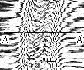 After the mercury lamp has warmed up and reached normal operating intensity, select for observation a portion of the field where the sharp boundary between the liquids is at right angles to the fringes. Replace the eyepiece with a film holder and bring the image of the fringes to focus in the plane of the film. If a special microscope camera is not at hand, it is not at all difficult to improvise one [see "The Amateur Scientist"; SCIENTIFIC AMERICAN, February, 1961]. Make an exposure after about three minutes, noting the time to the nearest second. The resulting photograph should resemble the illustration in Figure 2. The fringes that correspond to the bulk of the two liquids appear as straight lines at the sides of the photograph. The refractive index across the boundary of the drops varies continuously and causes the fringes to curve at the center of the photograph. Each fringe, whether it is straight or curved, represents a contour line of constant optical distance. A line, AA', drawn parallel to the straight portions of the fringes in the region of constant refraction represents a line of constant geometrical thickness across the wedge. The change of the optical path along this line depends solely on the change of refractive index along the line. Hence the closer the fringes that cross the reference line, the greater the variation of refractive index along the line. The variation can be evaluated by dividing the reference line into any convenient number of equal parts and counting the fringes that cross each part The resulting values are plotted vertically against the divisions of the reference line and joined by a smooth curve, as shown in the graph reproduced below. The value of the magnification is established by substituting a metric scale for the silvered slides on the microscope stage and drawing a line on the photograph that is equal in length to the distance between a pair of magnified millimeter graduations. A numerical term, the constant of diffusion, is then derived from the graph First, the area enclosed beneath the bell-shaped curve is measured. A planimeter can be used, or the measurement can be approximated closely by placing a sheet of translucent graph paper ruled with rectangular co-ordinates over the graph and counting the squares and fractions of squares that are included within the curve. The maximum height is determined by counting the column of squares that runs up through the top of the curve. In the case of the curve shown below, which corresponds to the fringes illustrated in Figure 2, assume that the height measures 12.7 squares and the area amounts to 61 squares. Assume also that the diffusing drops were in contact 180 seconds when the exposure was made and that the temperature of the room was 25 degrees centigrade.