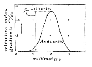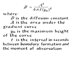 These four figures representing the height and area of the curve, the time and the temperature are substituted in the top equation on this page, which relates the several factors that determine the diffusion constant. The square of 61 (or 3,721) divided by 4 X 3.14 x 180 X 12.7 X 12.7 (or 364,644) yields the quotient: 1.09 X 10-2. Next, a scale-correction factor must be applied to transform the arbitrary dimensions of the graph paper into units of the centimeter-gram-second system. Comparative measurement discloses that 4.5 squares of the graph paper equal the length of the magnified scale representing one millimeter on the silvered slides. The metric height of the curve is therefore equal to 12.7 divided by 4.5 or 2.83 millimeters (.283 centimeters). This dimension is squared in the equation, so the quotient, 1.09 X 10-2, must be multiplied by the square of the scale-correction factor expressed in centimeters: 1.09 X 10-2 X (1/45)2 = 5.4 X 10-6, the value of the diffusion constant in square centimeters per second for a 10 per cent solution of sucrose diffusing into tap water.